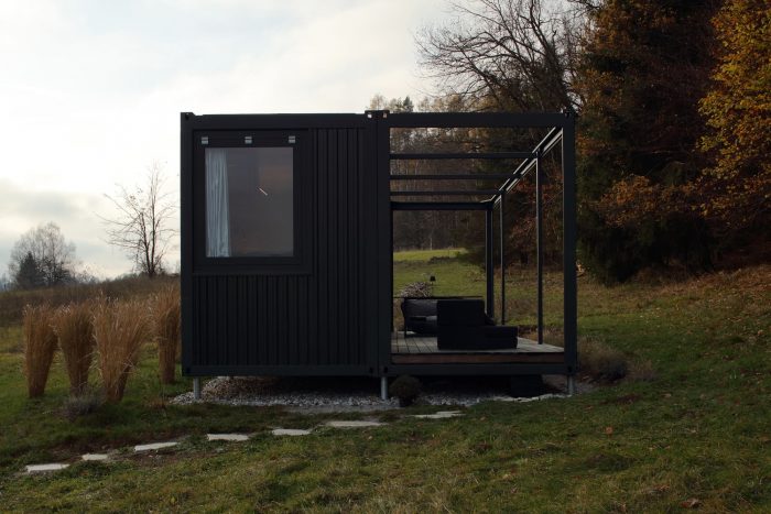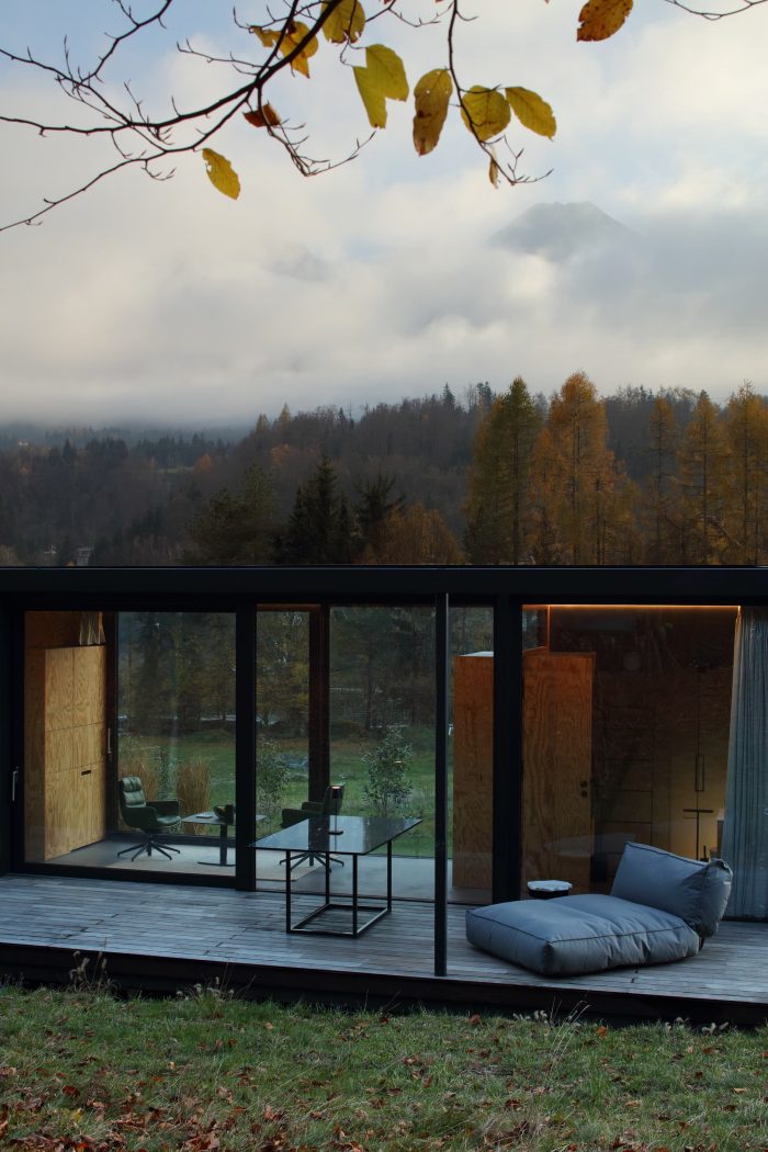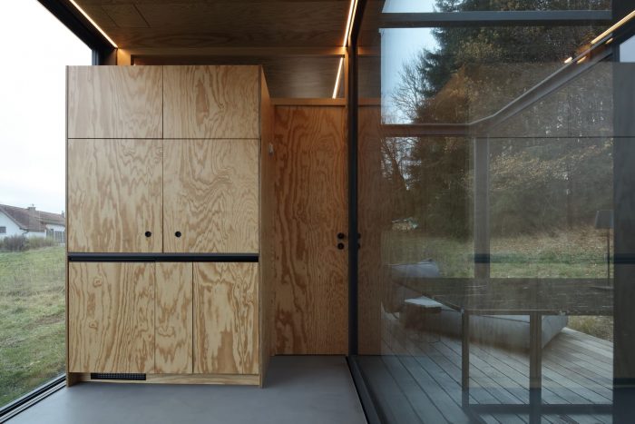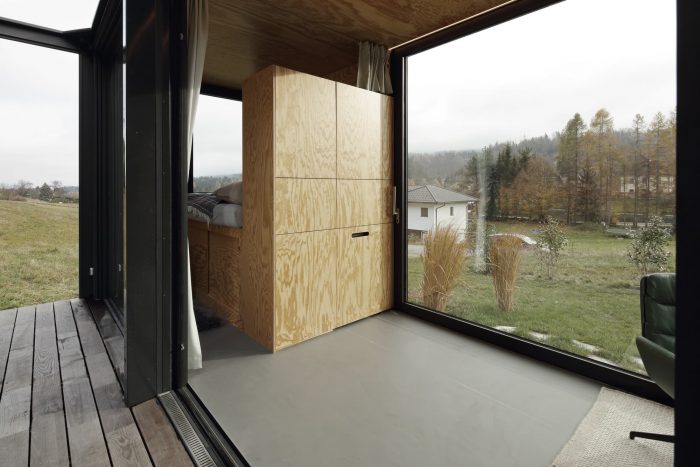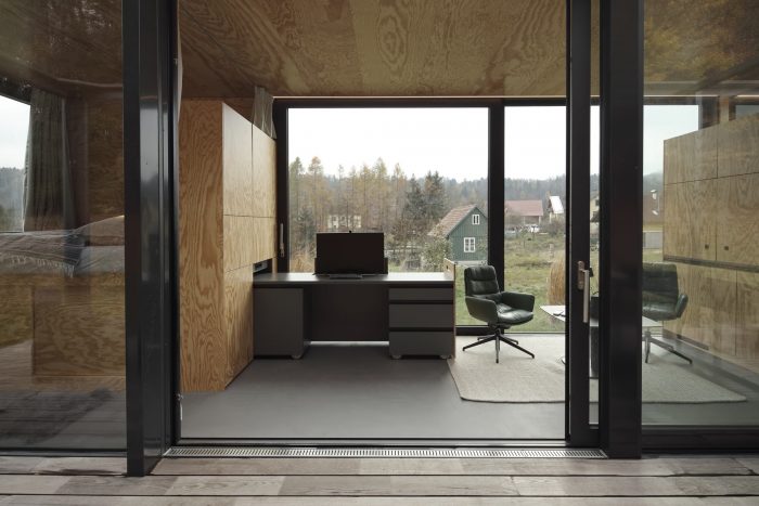 To make the most of the space available a desk including a foldaway screen can be pulled out from underneath the bed. The living module is complemented by a terrace module of equal size facing a beautiful treeline to the north. Because of this orientation, the terrace provides privacy and is being shaded on hot summer days while the forest acts as natural air conditioning.