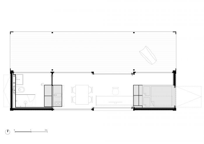 由于这个方向,露台提供了隐私,并在炎热的夏天被遮蔽,而森林作为天然的空调。紧凑的空间被划分为4个同等大小的区域:卧室、生活/工作区、厨房和浴室。尽管空间上的限制,浴室和厨房设备齐全,包括现代便利设施,如洗碗机和洗衣机。