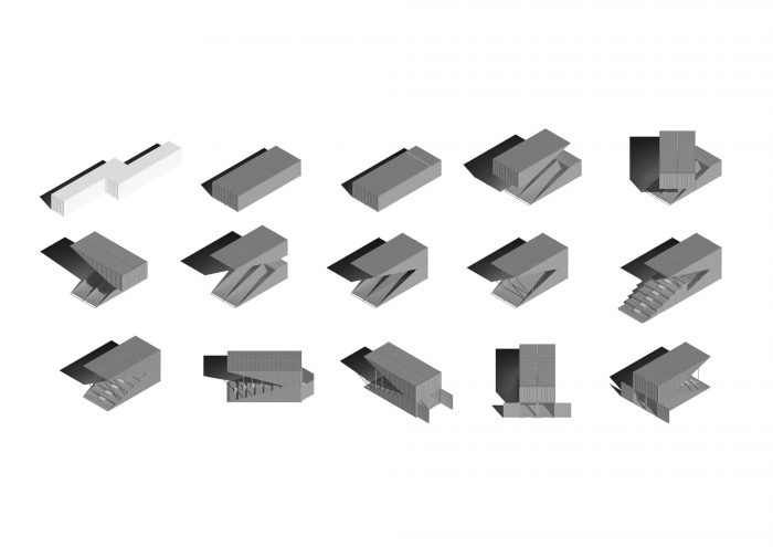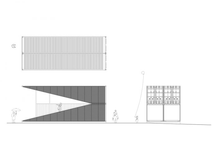 The Mobile Podium was conceived as a pragmatic and yet spectacular platform for debate and public exchange. A demountable structure that is comprised of two standard shipping containers sliced diagonally and flipped 180 degrees on top of each other. Two additional support structures are placed to frame the cantilever. This alteration of standard shipping containers, created a set of cascading public seating areas and an internal space, tucked underneath the bleachers. The seating is designed for public gatherings whereas the space below can host support functions and information regarding specific programs. The cantilevering roof completes the lower shape visually while also providing shading and protection in various climates. The Mobile Podium is designed to be dismantled and reinstalled on any site with the use of a standard cargo truck.