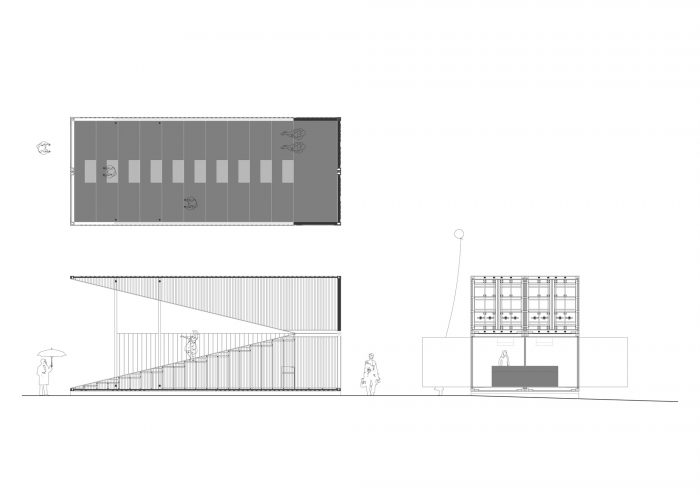 移动平台被设想为一个实用而壮观的辩论和公共交流的平台。它是一个可拆卸的结构,由两个对角线切开的标准集装箱组成,并在彼此的顶部翻转180度。另外两个支撑结构被放置在悬臂的框架内。这种对标准集装箱的改造,创造了一组层叠的公共座位区和一个内部空间,藏在看台下面。座位是为公众集会而设计的,而下面的空间可以容纳支持功能和有关特定项目的信息。悬臂式屋顶在视觉上完成了较低的形状,同时也在各种气候条件下提供遮阳和保护。移动讲台的设计可以通过使用标准的货运卡车在任何地点进行拆卸和重新安装。