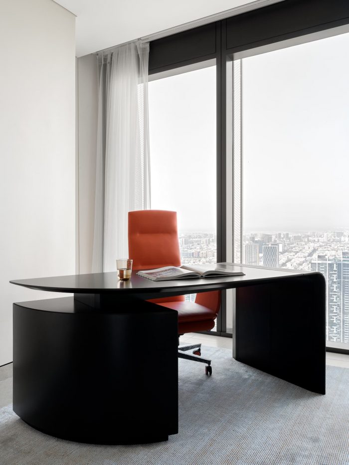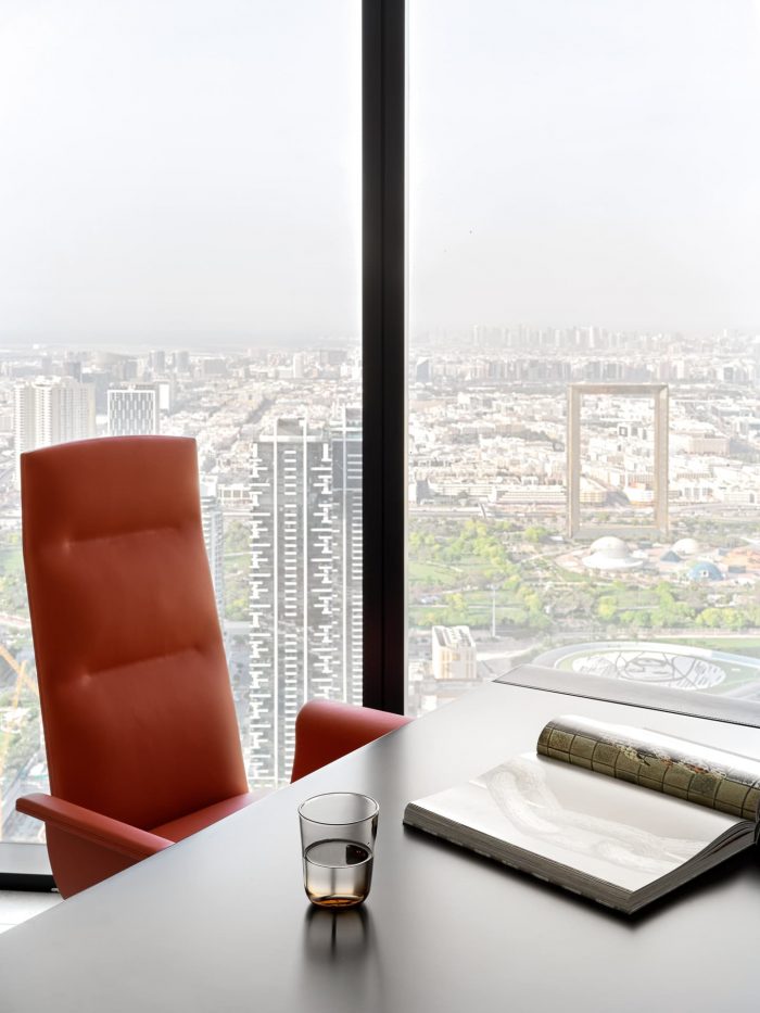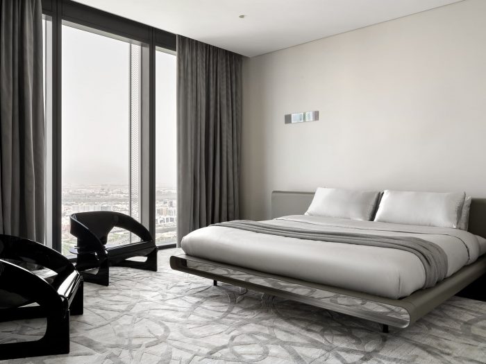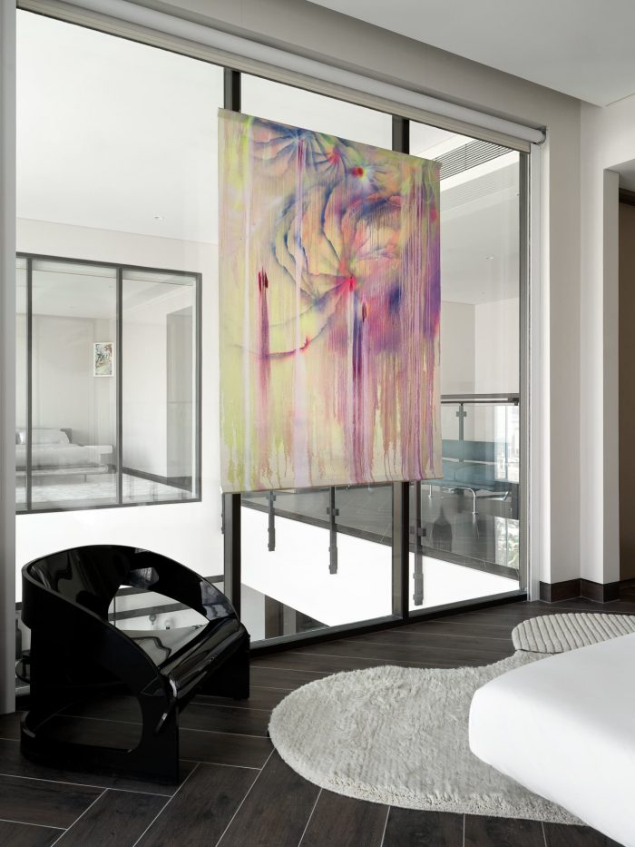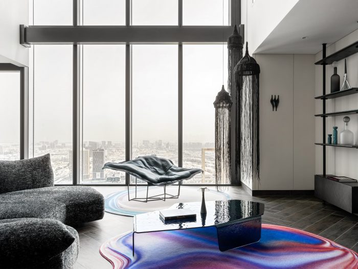 The main goal was to create a bold, daring, artistic interior in the public areas, while making the bedrooms soft, neutral, and enveloping. These apartments are intended to be used for short-term visits, for relaxation, cocktail parties, and DJ sets with friends. The colorful lights of nighttime Dubai perfectly complement the vibrant strokes of unique furniture pieces, designed for sophisticated, well-traveled individuals with high expectations for comfort and beauty.