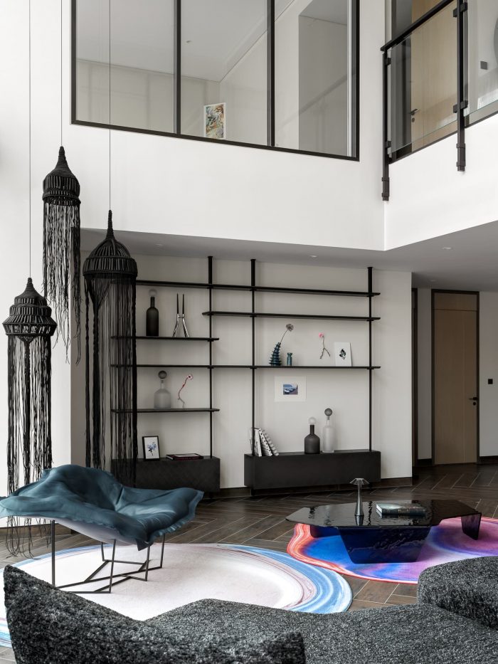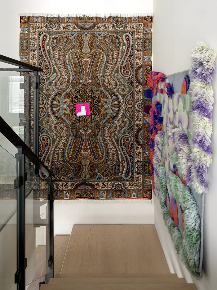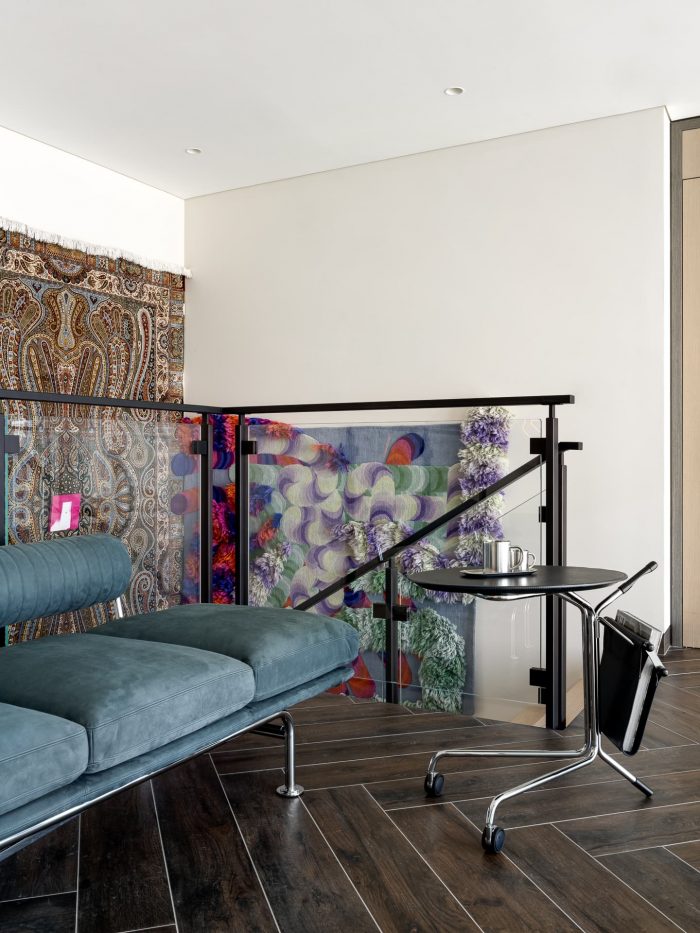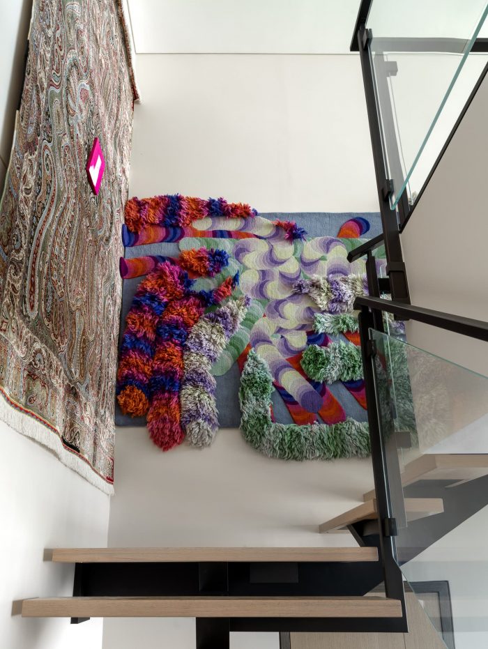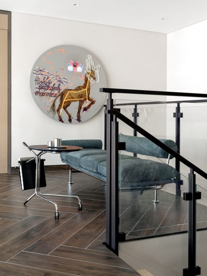 The composition in the second-floor hallway is a particular highlight, where a chaise lounge is paired with an I4Mariani table. A very unconventional art object — a metal giraffe with a fan by Maria Fedorova — adorns the wall, combining image, sound, and movement. The combination of a vintage rug on the staircase, bought at a market in Dubai, and a bright CCTapis rug underscores the fusion of cultures, drawing a clear parallel with the bold graphics in the living room.