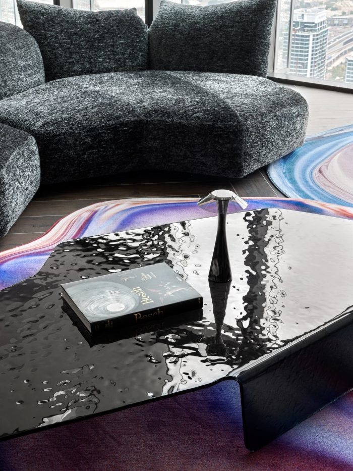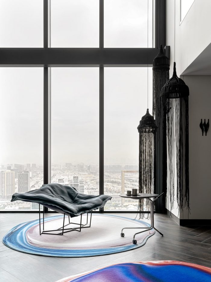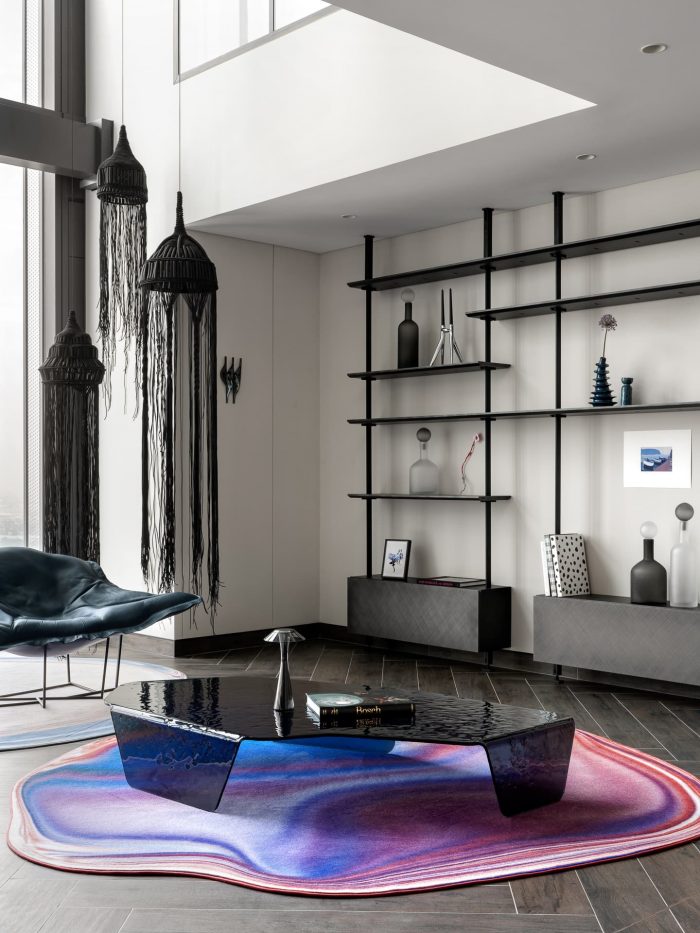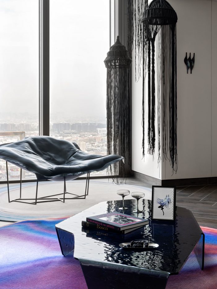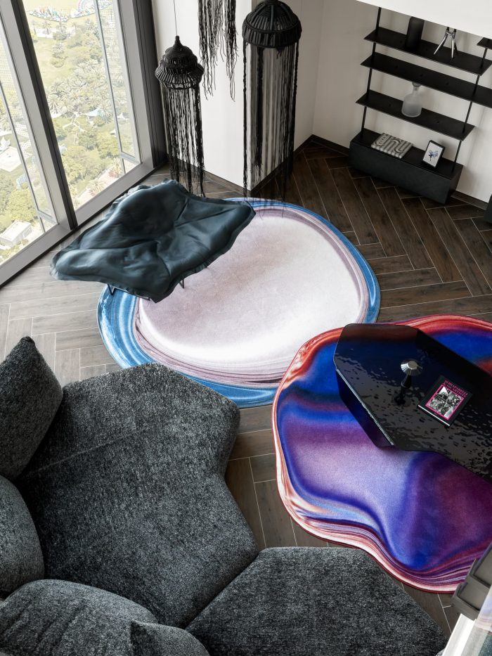 The living room design centers around bold, large accent pieces. The iconic Edra sofa, stunning 3D-effect rugs from Moooi, a complex-shaped and colored dining table — a novelty from Zanotta's collection — and the very comfortable leather armchair from Poliform. This carefully curated setting encourages intimate conversations or quiet contemplation of the cityscape beyond, blending comfort with urban energy.