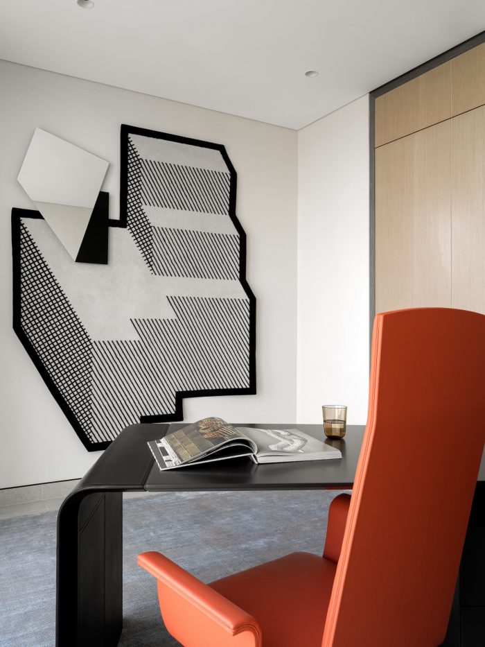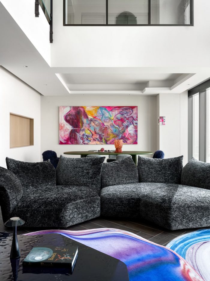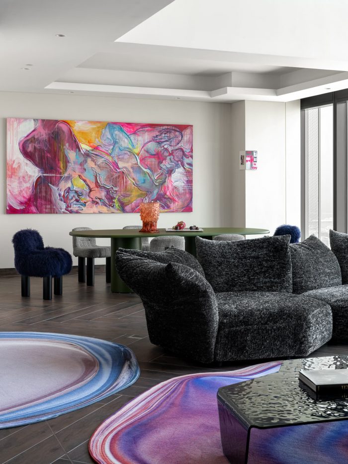 From the outset, the designers envisioned contemporary art as the focal point of the interiors, and a striking piece from Alisa Gorelova's 'Tightness' collection became the dominant color in the dining area, setting a lively artistic tone throughout the interior. The color palette, shapes, materials and textures all revolve around this vivid abstract piece.