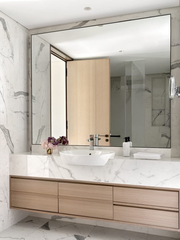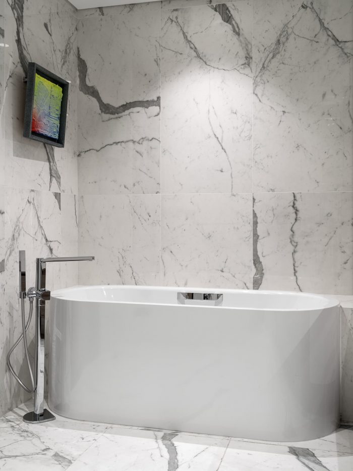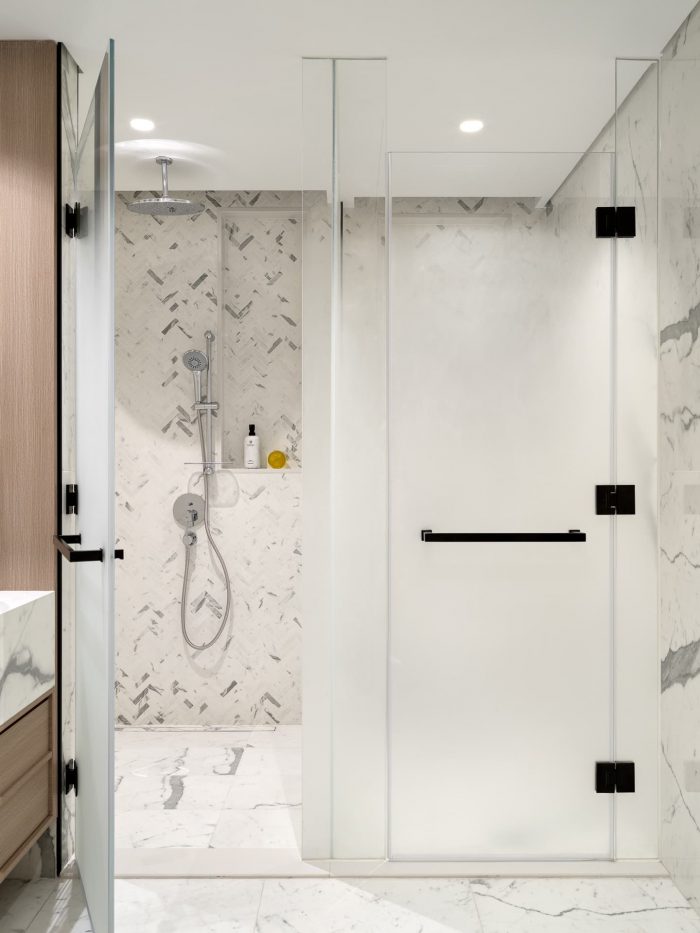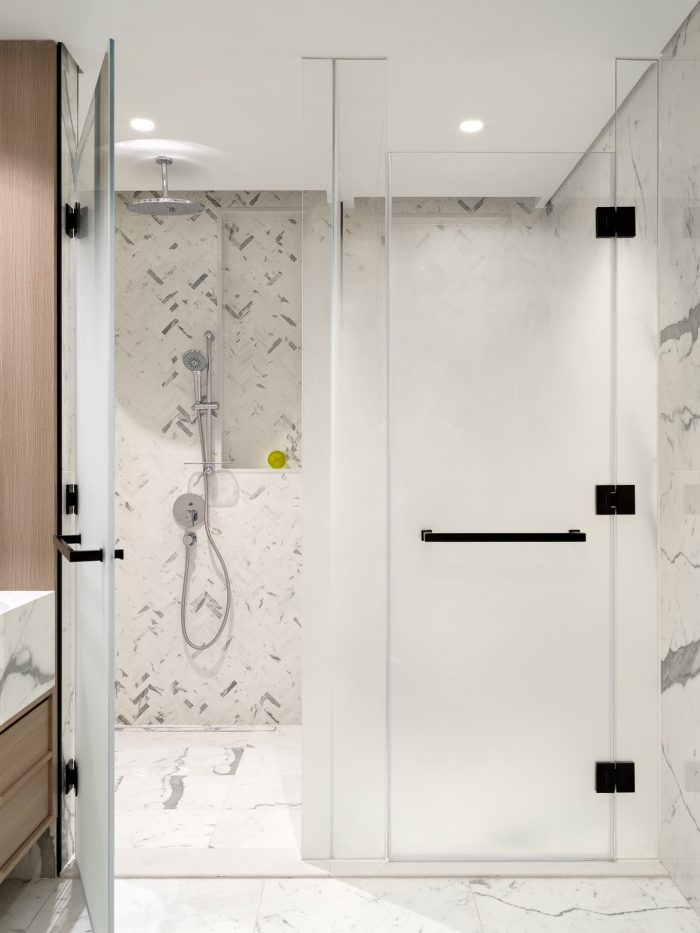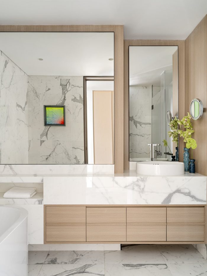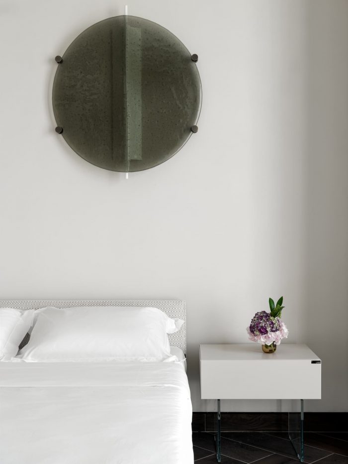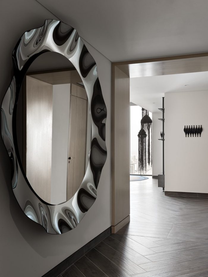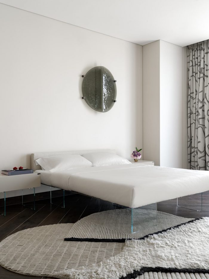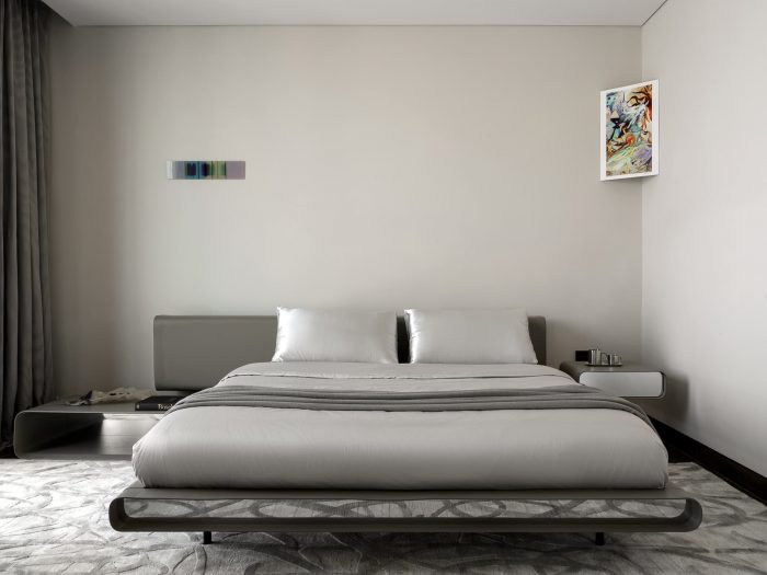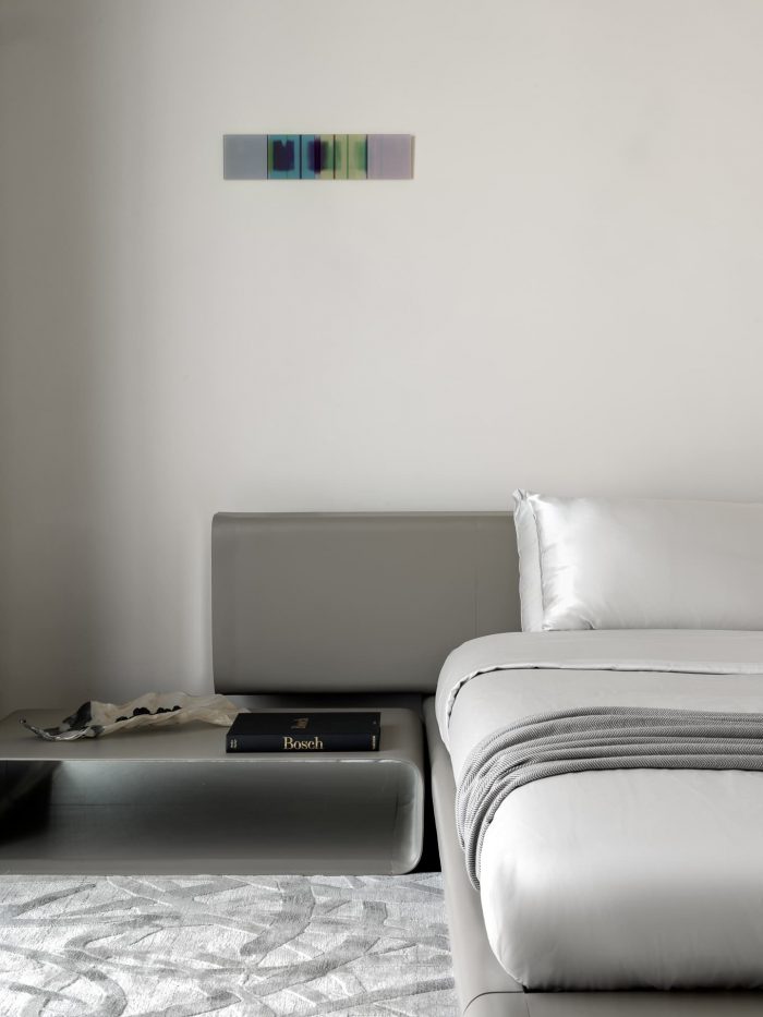 For the bedroom, the designer chose a slightly metallic gray palette, complemented by the smoothness of silk and the shimmer of polished leather. This soothing environment provides a break from the hustle and bustle of the city, restoring balance and welcoming a new day.