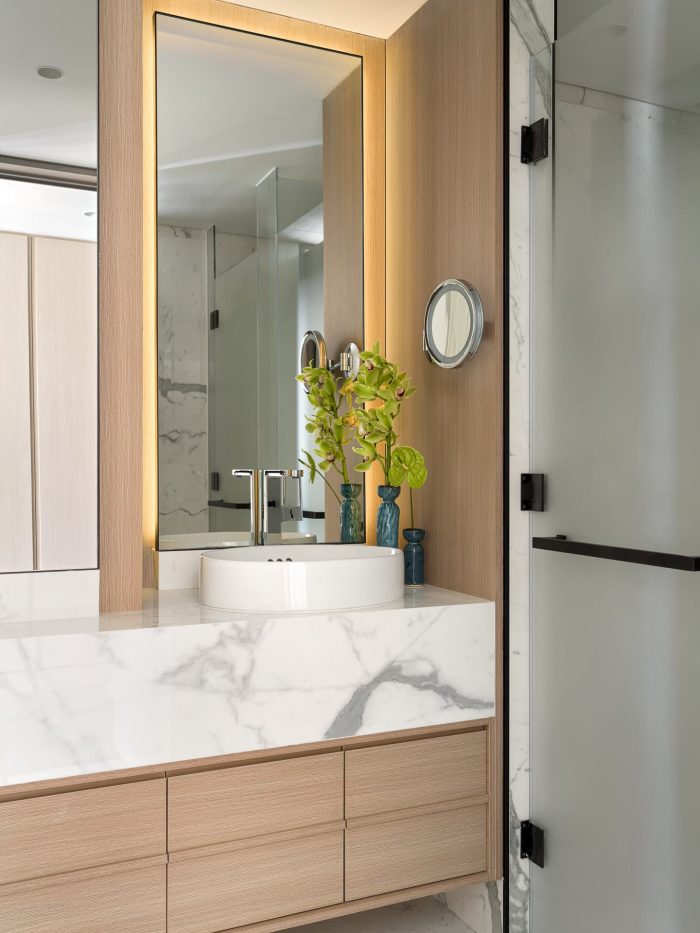 在卧室中,设计师选择了略带金属光泽的灰色调,辅以丝绸的光滑和抛光皮革的闪亮。这种舒缓的环境能让人从喧嚣的城市中脱离出来,恢复平衡,迎接新的一天。