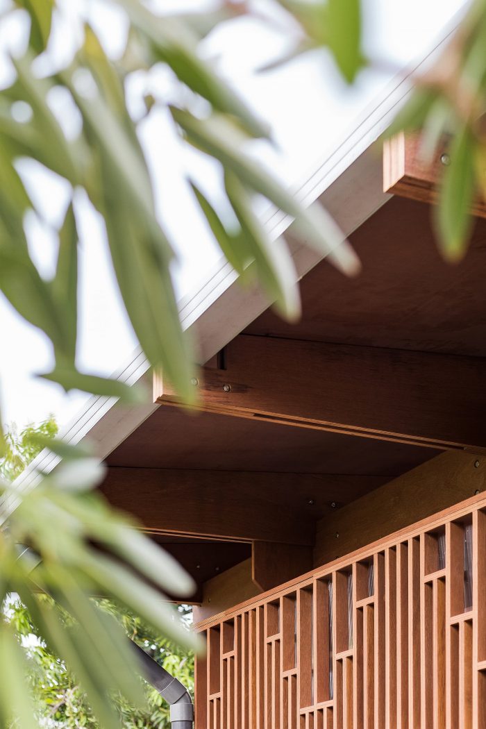 Apart from the bundled posts, made from 4 finger joint laminate elements, the whole system was designed with plywood panels to keep the costs low and to be assembled via lap, cross lap, and layered bridle joints. In that sense, one of the ideas behind premanufacturing is also to reduce design effort, time, and costs compared to individually designed buildings giving communities more value for their money. For uneven, natural terrain, the whole building will rest on an exposed corner foundation to keep the timber out of the water during wet and rainy seasons like traditional buildings on stilts called ‘Rumah Panggung’. Here the height of the raised platform at the library and veranda floor matches the seating height of humans so that it can be used as a bench and easy access.