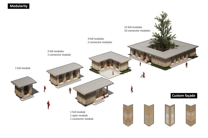 By combining two modules, one will get an in-between space of exactly one module size, which can be finished with the same façade and flooring elements. With that, it is possible to create a building configuration with various porosities in the form of enclosed spaces or verandas. It is further intended to offer customizable façade panels and patterns so that each Microlibrary MoKA has a unique appearance or can be differentiated as a response to external conditions like building orientation in relation to solar heat gains.