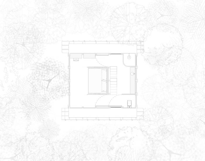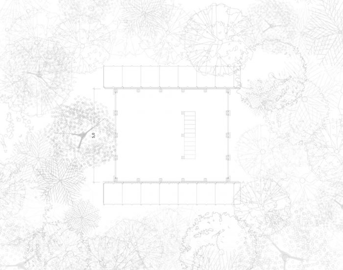 猴屋的结构由相同外形的木质构件协同工作,并由镀锌皮和热声绝缘材料覆盖。猴屋被安装在一片次生林中,安装在树木之间,占地5m x 6m,因此对当地植被的干扰很小,总面积为86m2。森林的感知是垂直的。地平线是倒置的,顺着能量、物质和树木生长信息的流动,引导我们寻找能量、阳光。