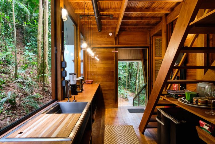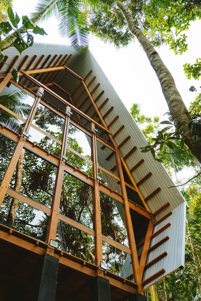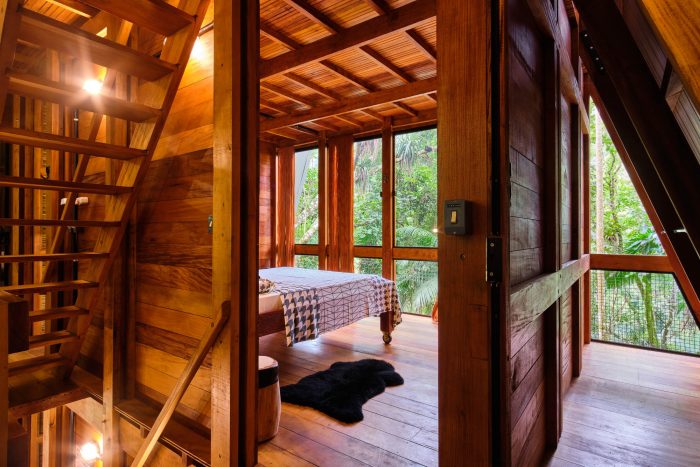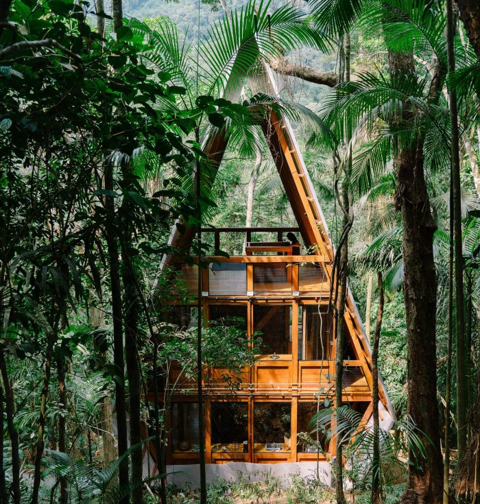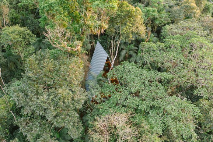 Monkey House structure works synergistically between wooden components all of the same profile, covered by galvalume skin and thermoacoustic insulation. Monkey House was assembled in an area of secondary forest, installed between trees, occupying a small area of 5m x 6m, thus creating zero interference in the local vegetation with a total area of 86m2. The perception of the forest is vertical. The horizon is inverted, following the flow of energy, matter, and information on the growth of trees to lead us in the search for energy, sunlight.