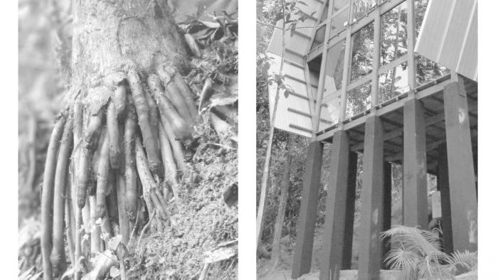 The best design solutions already exist in Nature. For 3.8 billion years, life creates elegant solutions in intelligence and simplicity. In order to design the support structure of the Monkey House, we were observing which plants were better adapted to the topography of the land and which strategies were adopted to allow stability in height growth. The juçara or içara (Euterpe edulis) in Tupi, is an endemic palm of the Atlantic Forest which is structured through props roots, adapting itself to the downhill terrain and distributing the dynamic weight on multiple vectors ensuring stability for the thin and very tall stalk.
