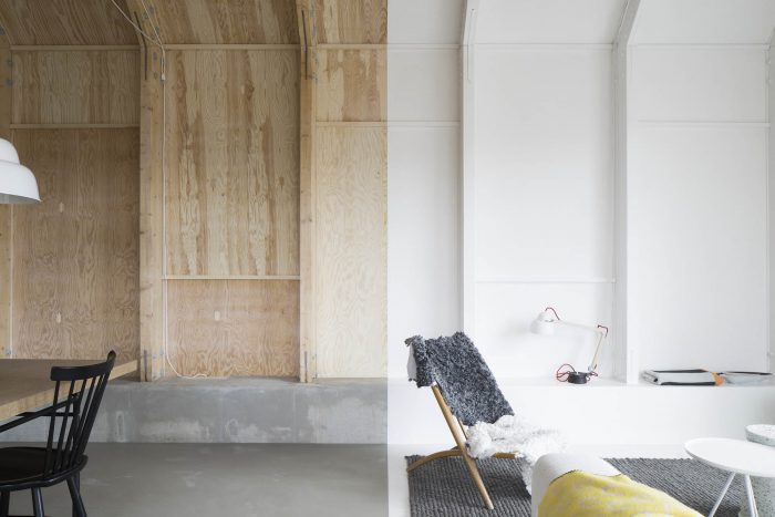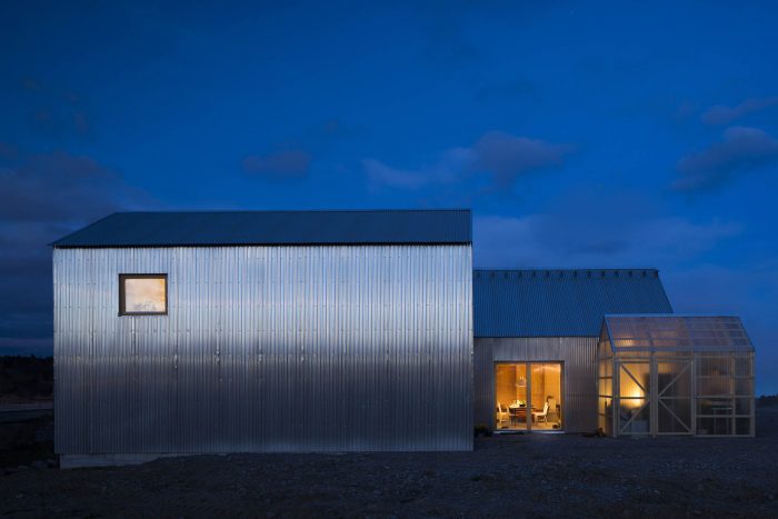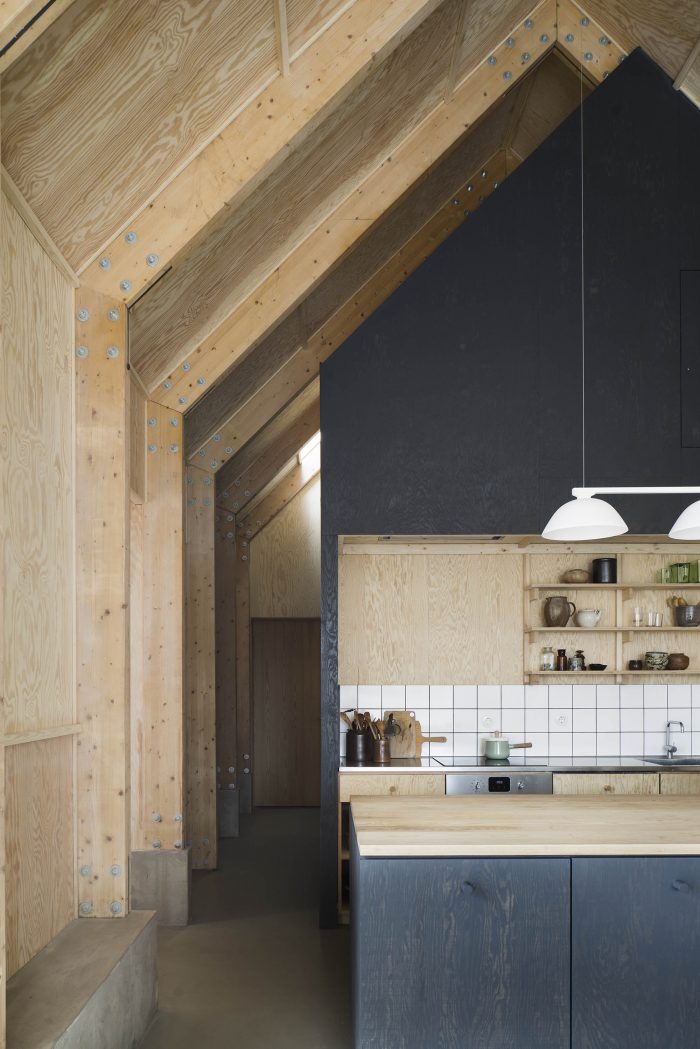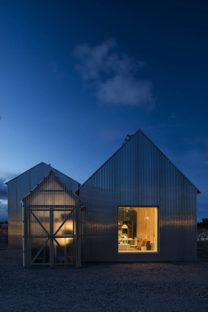 "House for mother" is a house that balances spatiality with intimate rooms - formal simplicity with strong materiality. The facade in raw corrugated aluminium creates a variable play with light and shadow during the day, a rich materiality contrasting with it's simple expression. The wooden beams and trusses along with the walls lined with plywood give warmth to the interior. The concrete floor is a durable and beautiful surface for everyday use, folded to a low bench along the perimeter of the building.
