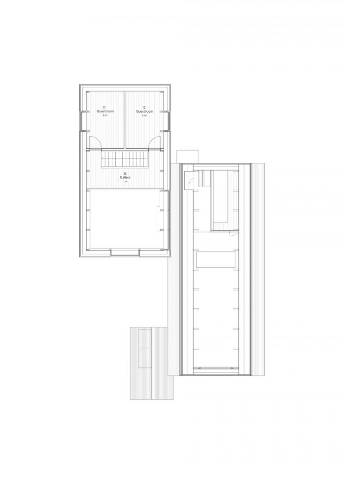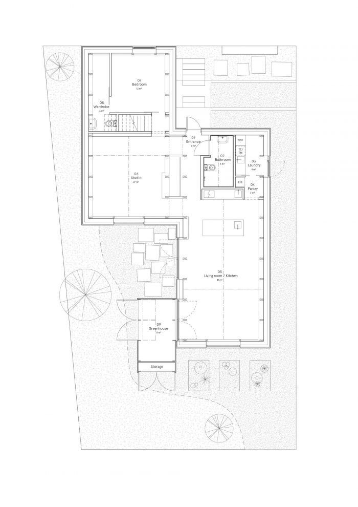 房屋被分成两个体量,彼此稍有偏移,强调了地块的狭窄程度。虽然暂时站在空旷的地方,但未来的城市环境最终不会比屋檐更多地暴露在邻居面前。
