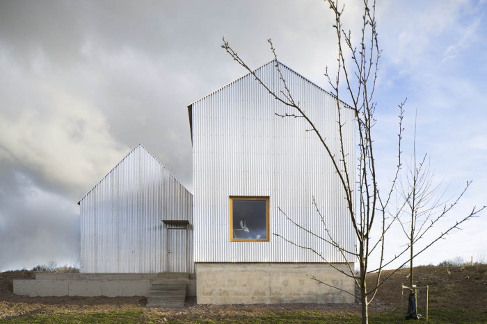 "给母亲的房子 "是一个平衡了空间性和私密性的房子--形式上的简单和强烈的物质性。原始波纹铝的外墙在白天创造了一个可变的光影游戏,丰富的材料与它的简单表达形成对比。木质横梁和桁架以及衬以胶合板的墙壁给室内带来了温暖。混凝土地板是一个耐用和美丽的表面,适合日常使用,沿着建筑的周边折叠成一个低矮的长凳。