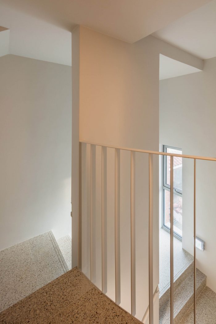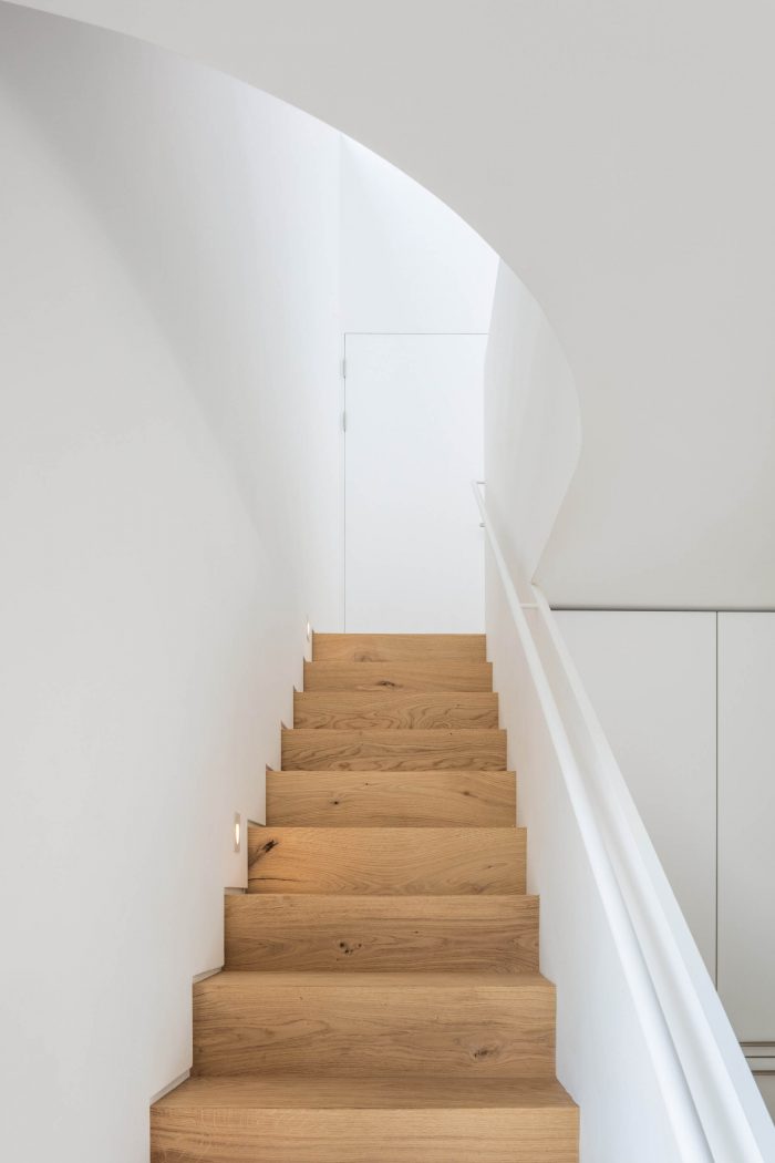 建筑的公共楼梯代表着结构美,也是重组密度的结果。位于楼梯中心的墙体通过悬臂结构支撑着楼梯,同时也是一个带有扶手的综合体。这种外观反映了仆人空间的压缩密度。