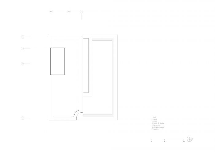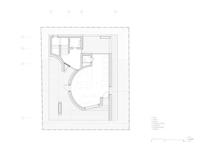 The curved volume leads visitors from the street to the lobby while accommodating the program. It provides spaces to neighbors and pedestrians, being set back from the road. Lowered 700mm down in level, the retail shop attracts visitors separately. This level difference enables outdoor space and each floor to have the necessary floor height under the regulation of the entire building height.