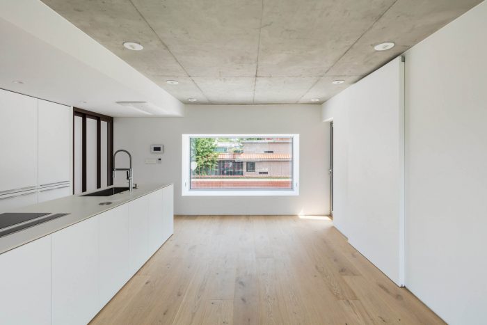 块体的 "倒角变化 "在内部继续,在客户家人居住的4楼和5楼住宅中被进一步放大。楼梯穿过体块的缝隙,光线从弯曲的天花板流入,创造了丰富的背景和纹理。被用力推开或大胆地从外面移开的部分成为每个住房的私人露台,使他们与周围的邻居有一个舒适的距离。