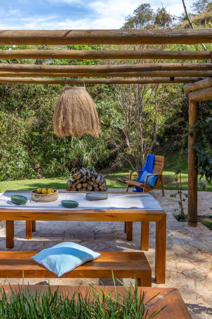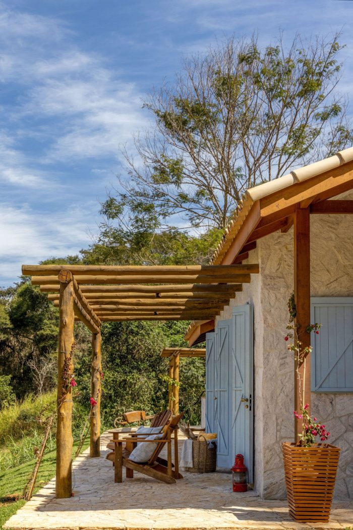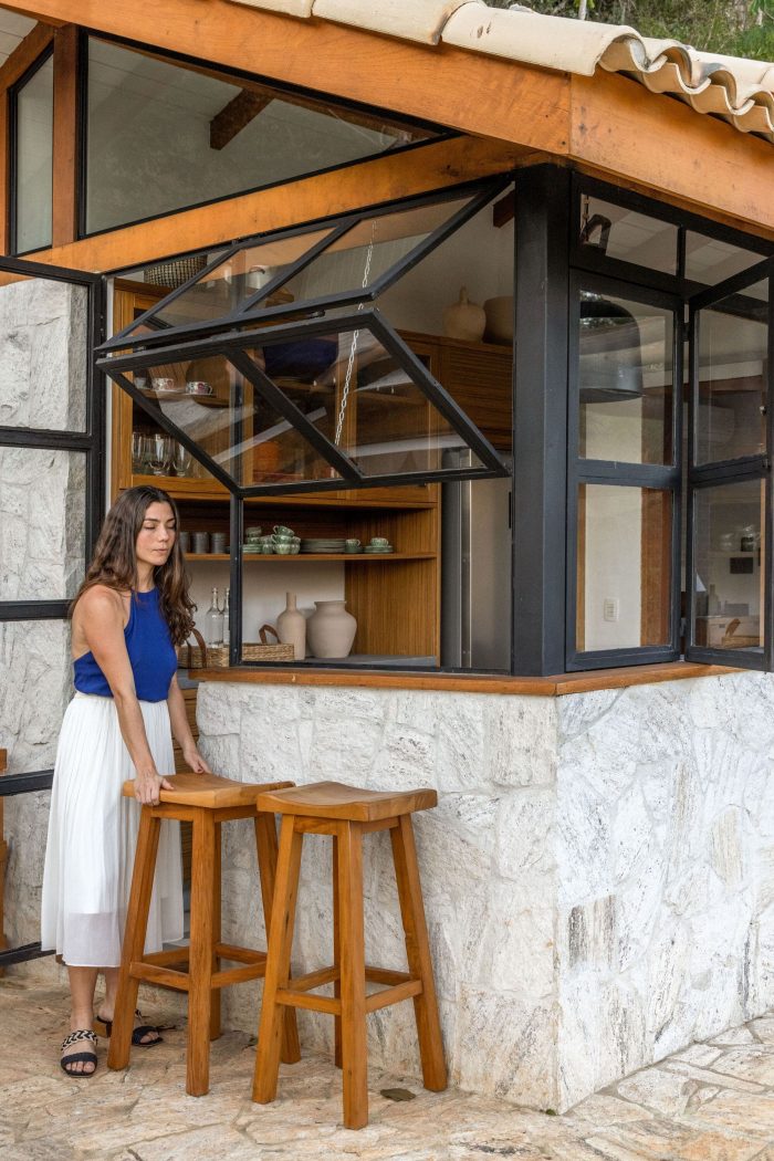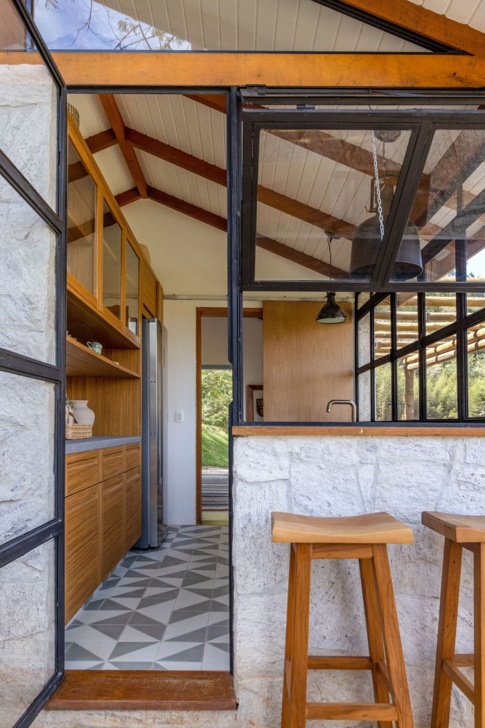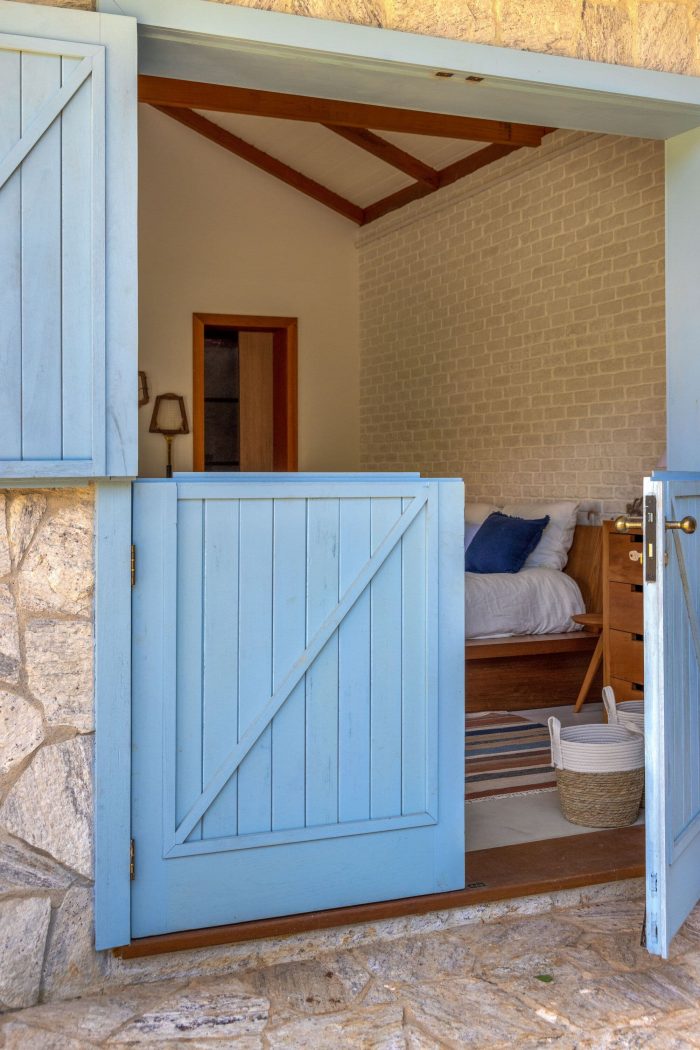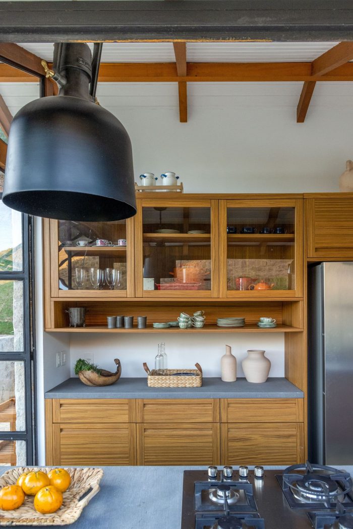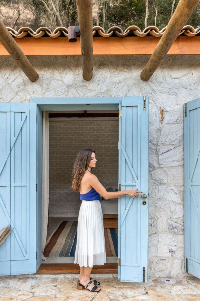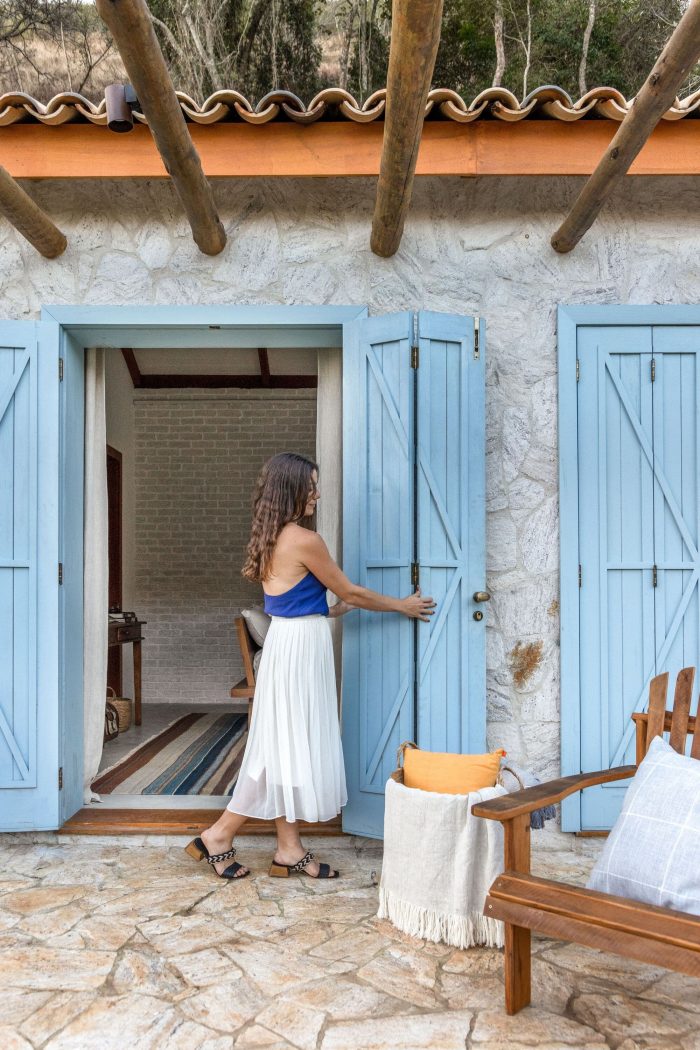 Large farmhouse doors create a cozy atmosphere, and the stone cladding brings that rustic look that reminds of the houses in Tuscany that Giovanna wanted for the project. The idea was to bring a local feel to the room, with large rustic wooden doors that allow full integration between the house and the surrounding mountain landscape. In addition, the light blue chosen for the painting contrasts with the stone wall, welcoming with lightness all who enter this space.
