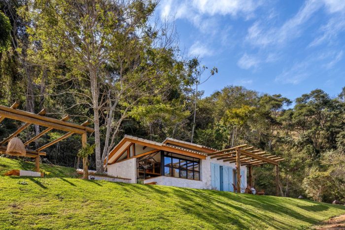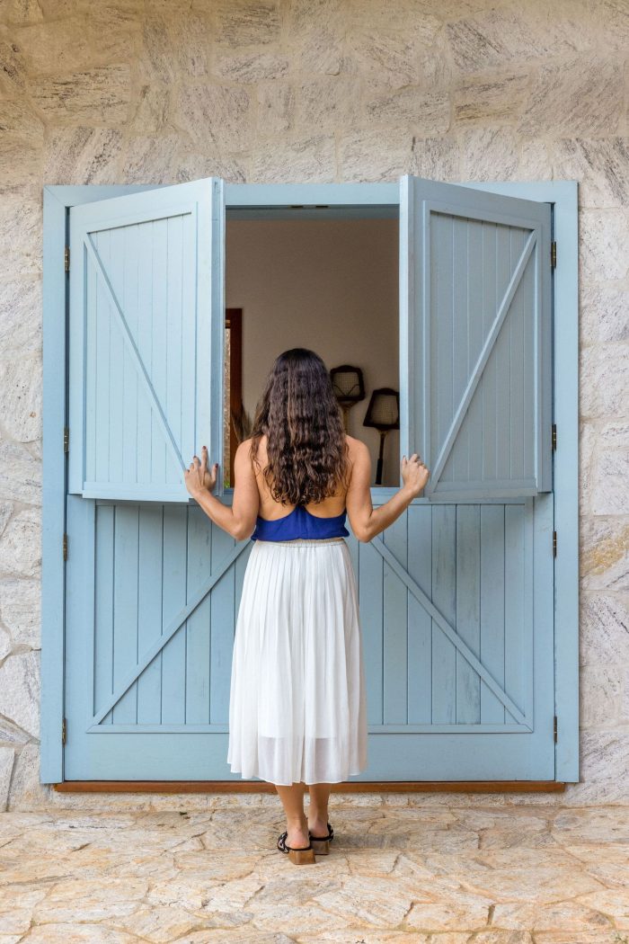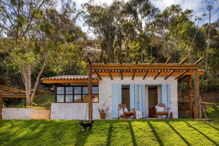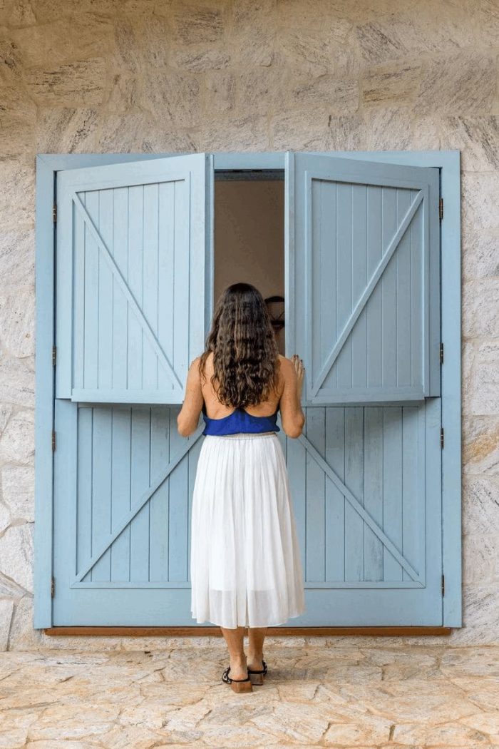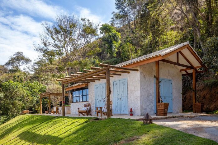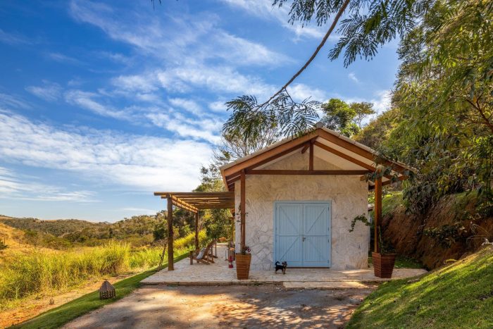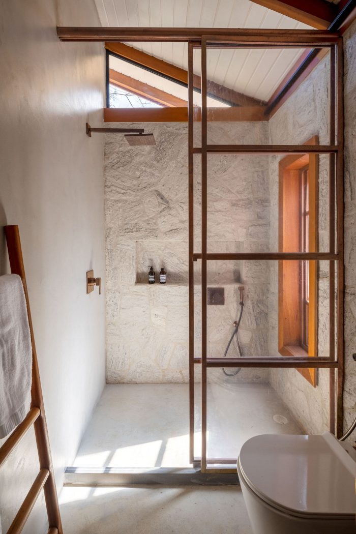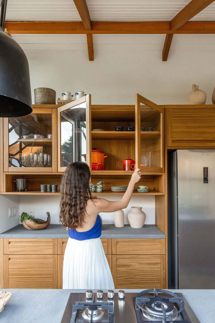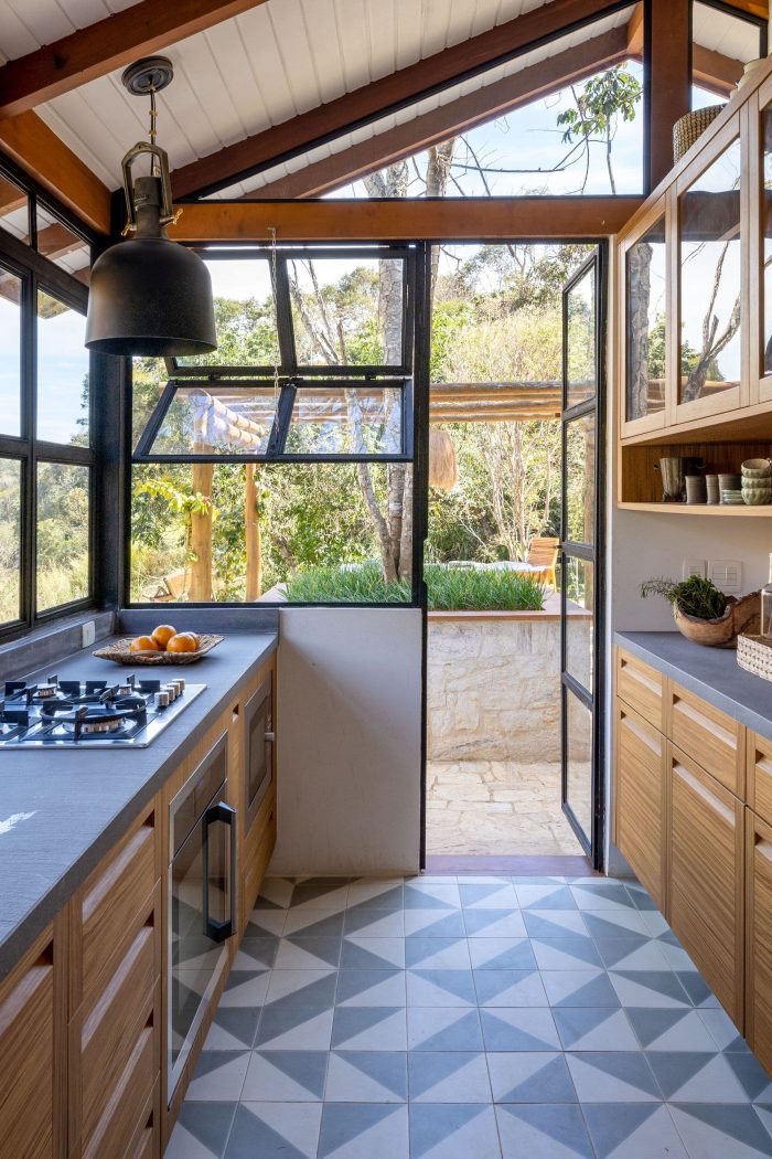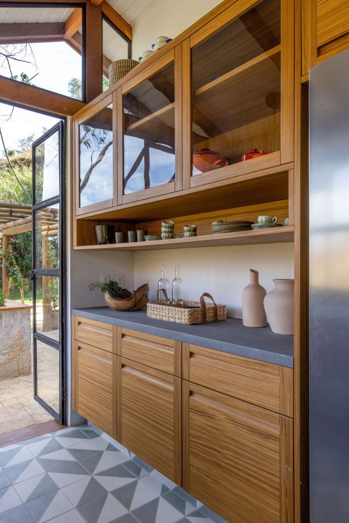 Large farmhouse doors create a cozy atmosphere, and the stone cladding brings that rustic look that reminds of the houses in Tuscany that Giovanna wanted for the project. The idea was to bring a local feel to the room, with large rustic wooden doors that allow full integration between the house and the surrounding mountain landscape. In addition, the light blue chosen for the painting contrasts with the stone wall, welcoming with lightness all who enter this space.