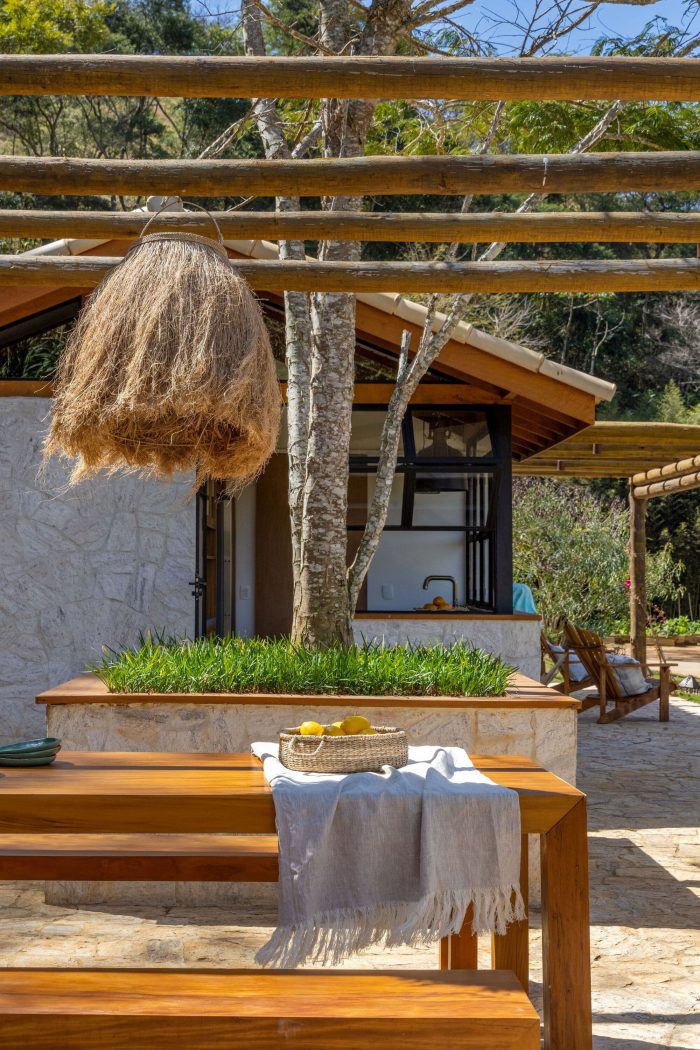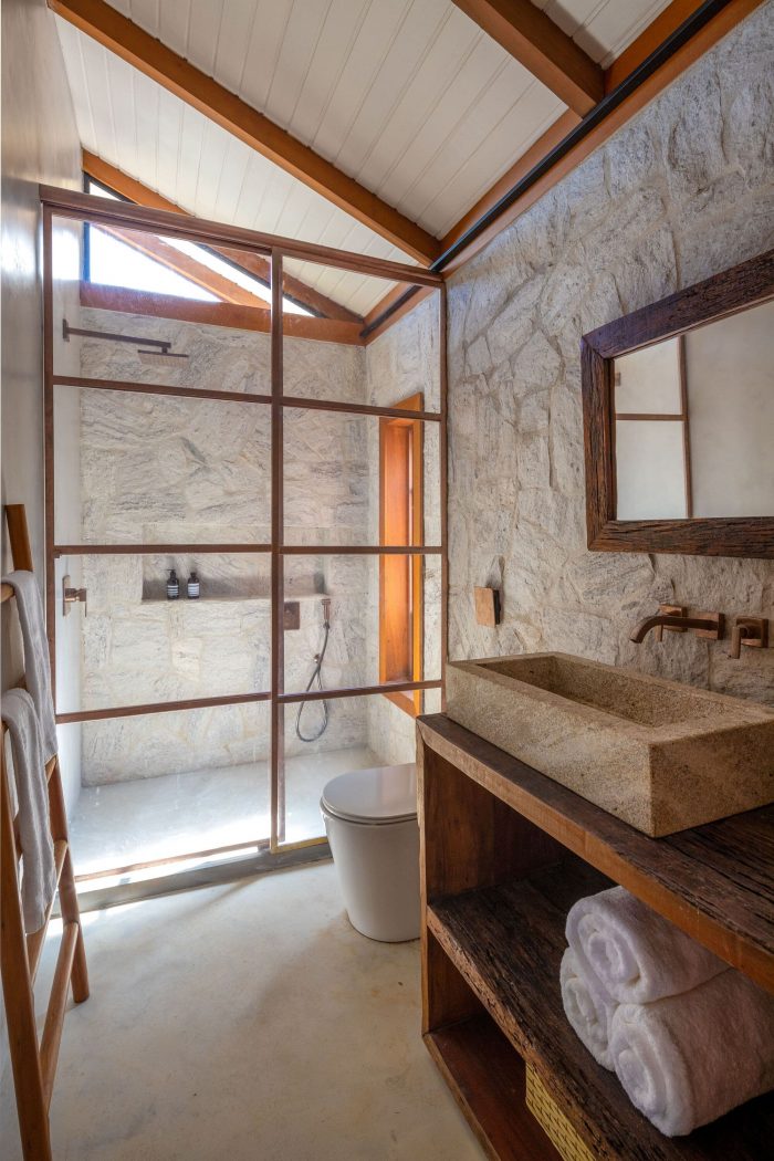 Bruno and Giovanna asked for a cozy design that integrated all the environments of the house. Dining room, kitchen and living room, because the family loves to receive friends and be with everyone together. In our interior design project we chose coverings with natural textures: stone walls and floors, and wood panels to bring a warm touch. In the bathroom organic shaped mirrors bring charm and a stone carved tub.