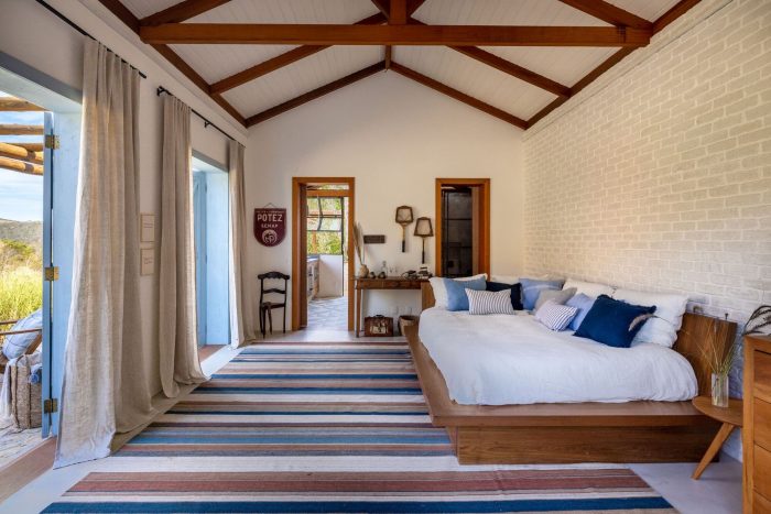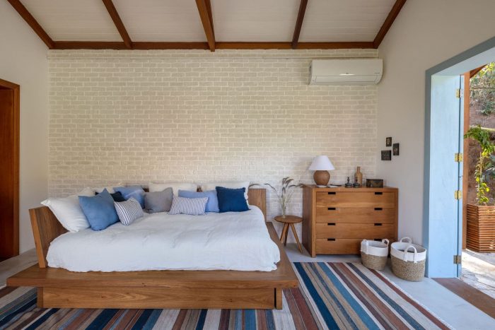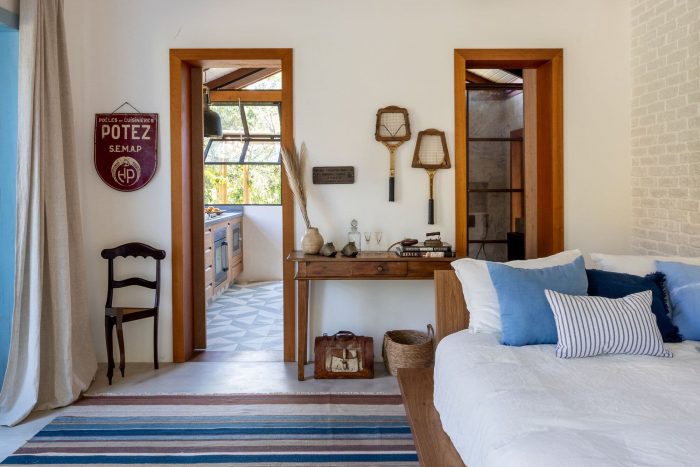 In the project we chose to leave the internal structures apparent, both in the ceiling and the brick wall. To make it even more cozy and comfortable, we chose large armchairs and placed the bed in the center of the room. This is a good solution for the house, where the living room will also work as a bedroom to receive Giovanna and Bruno's guests.