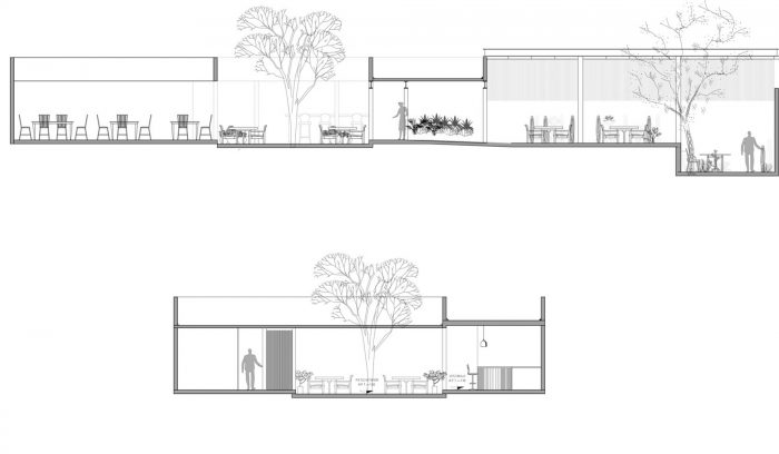 The recycled, reused, reinterpreted space will guarantee administrative areas, services, storages, kitchen, playroom and different areas for diners. Open spaces help maintain cross ventilation throughout the year responding to the current world situation. The most powerful intervention within the project is a steel roof around an olive tree over 100 years old, where through hanging metal sheets we generate protection towards the west and the first visual finish towards the street.