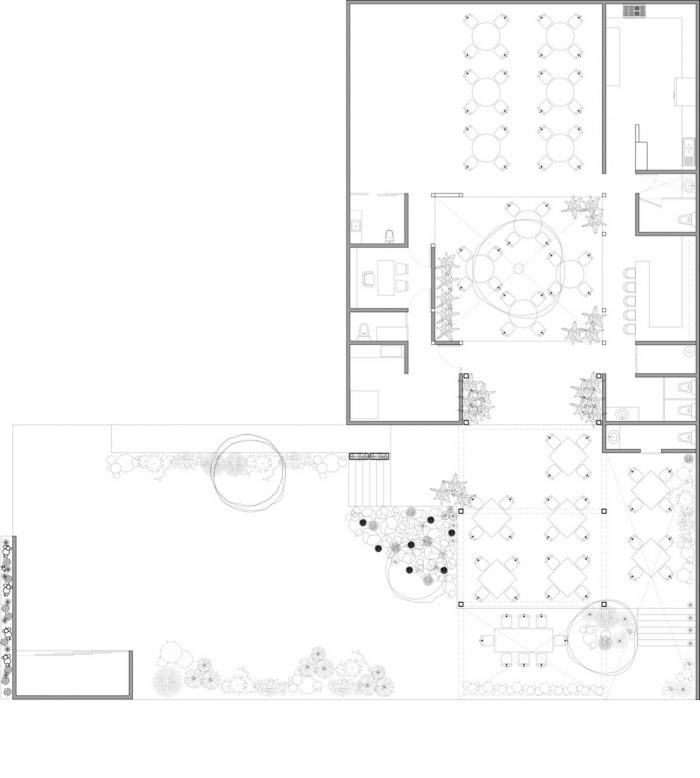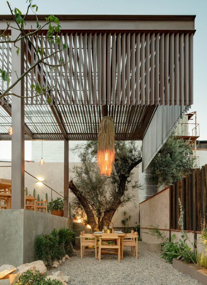 The recycled, reused, reinterpreted space will guarantee administrative areas, services, storages, kitchen, playroom and different areas for diners. Open spaces help maintain cross ventilation throughout the year responding to the current world situation. The most powerful intervention within the project is a steel roof around an olive tree over 100 years old, where through hanging metal sheets we generate protection towards the west and the first visual finish towards the street.