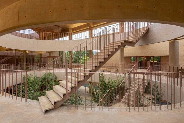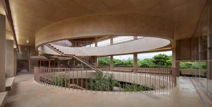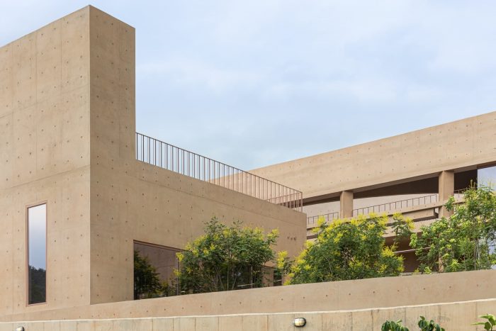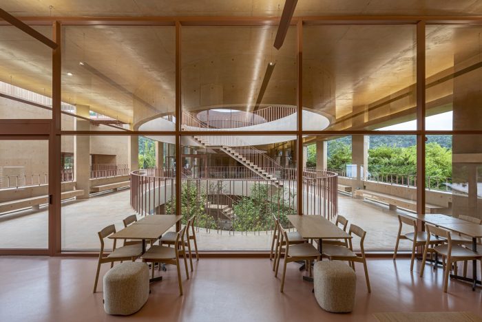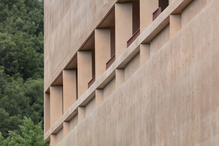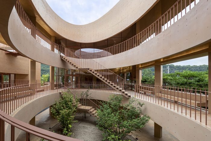 Thick Walls and Surface Depth - In order to accent the way the thick wall mediates between the inside and the outside, we wanted to express the depth and volume of the surface. In MRNW Daegu, we tried to reveal that the walls support both gestures of the interior and exterior by individually highlighting all horizontal and vertical elements: benches integrated with the wall, columns rotated by 45 degrees, awnings, openings, et cetera. Through this, the surfaces are dented and protruded within the range of the thickness of the exterior wall; it shows various shadows and gives different expressions over time. In particular, the three-story façade facing the pine grove is not only a frame and a device that provides a view of the forest from the inside of the building but also an element that becomes the background of the forest from the outside of the building.