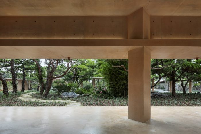 In particular, the corridor crosses and separates the client’s father's old garden and the pine grove in order to classify the two spaces. This is to create a new multi-layered spatial depth by vaguely dividing the previously unbounded space and defining the area. All columns are rotated 45 degrees based on the axis, which constitutes the boundary of the main external space and creates three-dimensional effects on the façade. The eaves are designed to be 2-meter high that people can reach, which maximizes the openness of the next space beyond when the spaces are shifted; The hanging water walls are also means of emphasizing verticality and the shape of the oval courtyard of the ellipse building. The benches on the exterior walls provide a view towards the adjacent outside for people who sit leaning against the building. The exposed concrete was adopted as the main construction material in order for architectural elements to be integrated into the simple geometric volume of the building. Columns, eaves, perimeter walls, and corridors are incorporated into the building shell, which forms a thick elevation.