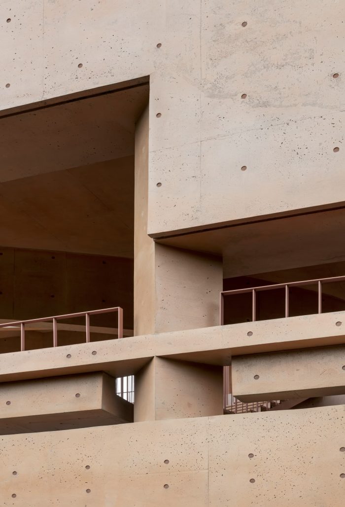 厚墙和表面深度--为了突出厚墙在内部和外部之间的调解方式,我们想表达表面的深度和体积。在MRNW大邱,我们试图通过单独突出所有的水平和垂直元素来揭示墙体支持内部和外部的姿态:与墙体结合的长椅、旋转45度的柱子、遮阳篷、开口等等。通过这种方式,表面在外墙的厚度范围内被凹陷和突出;它显示出各种阴影,并随着时间的推移给出不同的表达。特别是,面对松树林的三层外墙,不仅是一个框架和装置,从建筑内部可以看到森林,也是一个元素,从建筑外部成为森林的背景。
