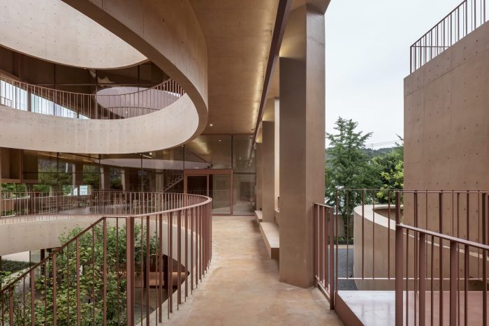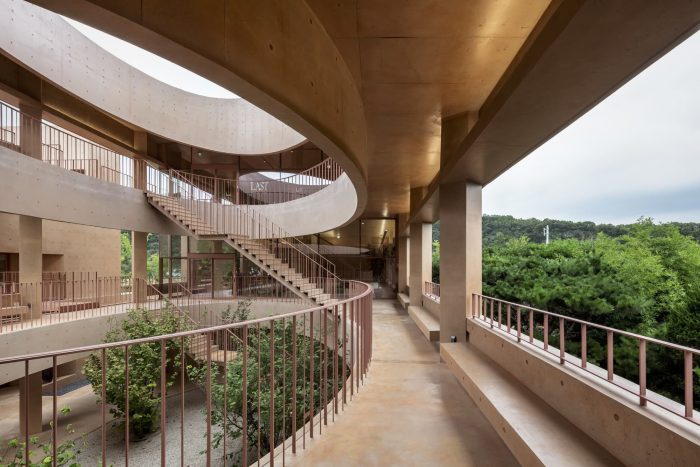 Elements: Perimeter Wall, Eave, Corridor, Column, and Hanging Wall - In cities, ‘Perimeter wall’ is often used to visualize ownership, especially in a defensive manner; however, MRNW Daegu has a generous site condition, and we wanted to leverage the perimeter wall as an effective design element that makes people walk along it or adds abundance to the outdoor space. Especially in MRNW Daegu, the densely planted existing trees on the farms bring in the perimeter wall as a background, allowing them to reveal their own appearance. In a simple plan system, architectural elements such as perimeter walls, eaves, corridors, columns, hanging water walls, and exterior wall benches are used in order to define the characteristics of the space between buildings and the gesture of the architecture towards the garden. The perimeter walls extended from the buildings are the main design elements that specify an outdoor area. Moreover, the walls and corridors also play a role in making people feel the external space like a room adjacent to the buildings.