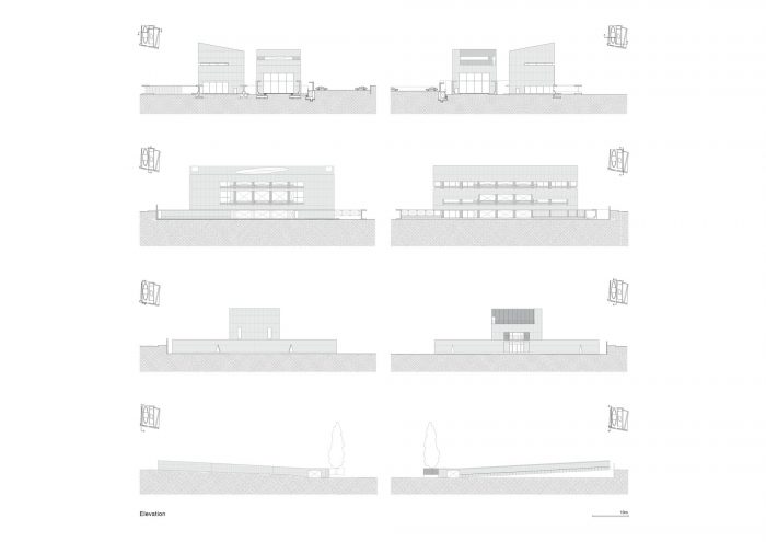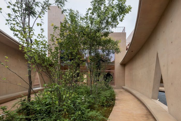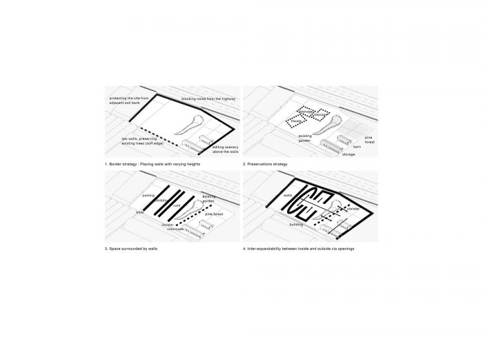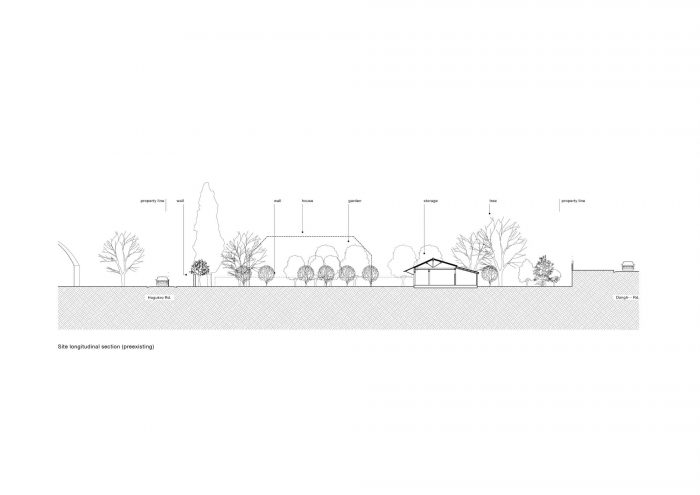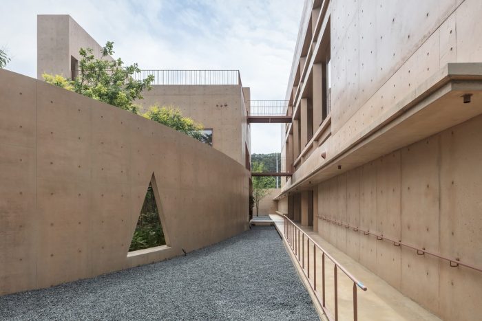 The southeast side of the site faces an arterial road having a height of 2 meters and the northwest side of the site faces a back road. An extended perimeter wall from the architecture is used to protect the complex from the noise of the upper and lower roads and from the speed of the vehicle and to create integrated territoriality. In addition to the perimeter wall, the eaves protruding from the building, the corridor, and the benches integrated into the exterior wall are used as architectural elements corresponding to the garden facing the buildings. The corridor surrounds the quaint old garden, and the benches attached to the walls allow people to look at this garden. When passing through the two buildings, people would pass under the low eaves about two-meter in height, so that the space would be clearly converted.