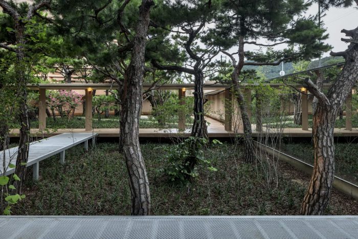 Like the layout of traditional Korean architecture, these spaces could give extraordinary experiences; for example, after walking along the perimeter walls, visitors open a door to enter somewhere, but to an outside space; or sometimes, open a door to exit somewhere, but to indoor space. As a reference, Soswaewon Garden organizes buildings in the forest and its exterior as a continuous flow through open perimeter walls. We learned from this old garden and came up with the planning strategy for the MRNW Daegu. As a result, the perimeter walls, the corridors, and the exterior walls of the buildings are defining altogether the territoriality of the adjacent exterior space. The interior and exterior meet through an intermediate area such as the eaves or terrace of the courtyard. The completion of the plan layout is achieved through internal and external narrative connections.