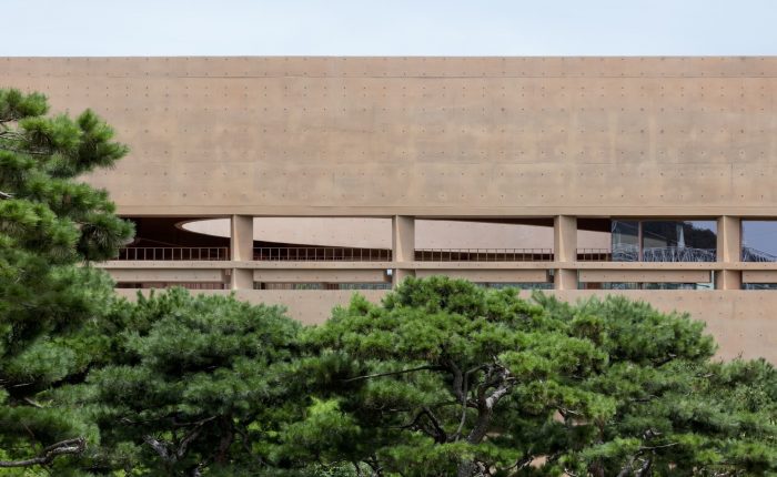 The divided two buildings are placed on a single side of the site, naturally forming multiple layers. The oval-planned and straight-lined walls meet to create various widths of space, and the exposed concrete canopy adjusts the height to keep the spatial tension. The smooth exposed concrete made of coated plywood constantly boasts an intense form of shadows, and the 45-degree rotated square columns contribute to the glamorous space. In addition to the spaces in the building, the new landscaping and stainless steel walls were added to the old pine forest and they also enhance the vitality of the space. Steel decks were installed at a height of about five steps on the floor in order for the old pine forest to be experienced from a different height. Through a minimal renovation process, two old warehouses create rough shades where visitors can travel to the past. It is a dynamic landscape created by the relationship between indeterminate programs, trees from different eras, and architecture.