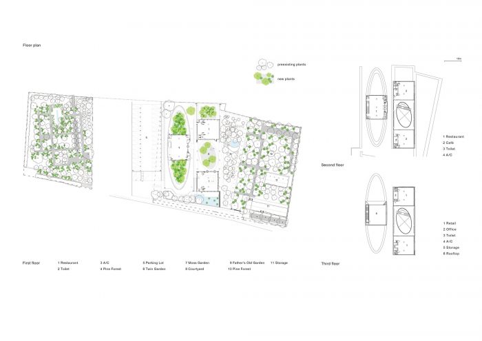 Establishing the Relationship between Architecture and Landscape - The site was full of landscaping plants that the client’s father had grown for 20 years, with a personal affection for trees, and also for sale. There were a company management housing and five warehouses; The site around the buildings was planted at a density close to that of a forest. Some of them had an old vintage garden that showed the tastes of the clients' fathers. The project was started by finding a spot for the new building. Finding the balance between demolition and retention and minimizing the number of trees relocated were important considerations for this process. A forest is a primitive-form shelter that is composed of a fluffy-textured roof that somewhat penetrates sunlight and rain, and columns supporting it. Basically, it is difficult to imitate or artificially create the atmosphere of the forest that 20 years of time made, within a relatively short time period where architecture is designed and built. But instead, there is a possibility that the newly added architecture will actively utilize this heritage. The master plan of the entire site was formed by leaning against the forest or adding contrast to the forest.