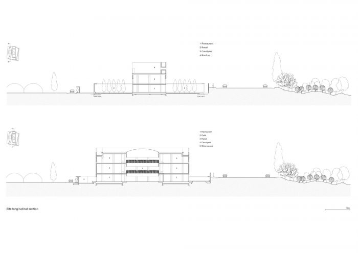 被分割的两座建筑被放置在场地的一个侧面,自然形成了多个层次。椭圆形规划的墙体和直线型的墙体相接,形成不同宽度的空间,裸露的混凝土天棚调整高度,保持空间张力。由涂层胶合板制成的光滑的裸露混凝土不断拥有强烈的阴影形式,45度旋转的方形柱子为迷人的空间做出了贡献。除了建筑中的空间外,新的景观和不锈钢墙被添加到古老的松树林中,它们也增强了空间的活力。为了让人们从不同的高度感受到古老的松树林,在地板上约五级台阶的高度上安装了钢制甲板。通过一个最小的翻新过程,两个旧仓库创造了粗糙的阴影,游客可以在这里穿越到过去。这是一个由不确定的程序、不同时代的树木和建筑之间的关系创造的动态景观。