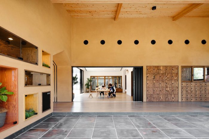 The recently monotonous nursery environment seems to be increasing. But in this project, we think it is a problem that rooms in many nursery schools are designed to be easy for adults to control children, so the facility where people spend a comfortable time feeling nature. As the environment feels like nature, some elements of the Japanese traditional house are installed which has many ideas to face nature and manage it. Deep eaves and large windows can take wind and sunlight which change depending on the seasons. Mud walls have heat-insulating and moisture-buffering effects. In these ways, children can develop physical function while feeling nature even inside. In addition, the two-adjoining room is also Japanese traditional house style. By making two rooms together, children can play around safely while the teacher watches them over.