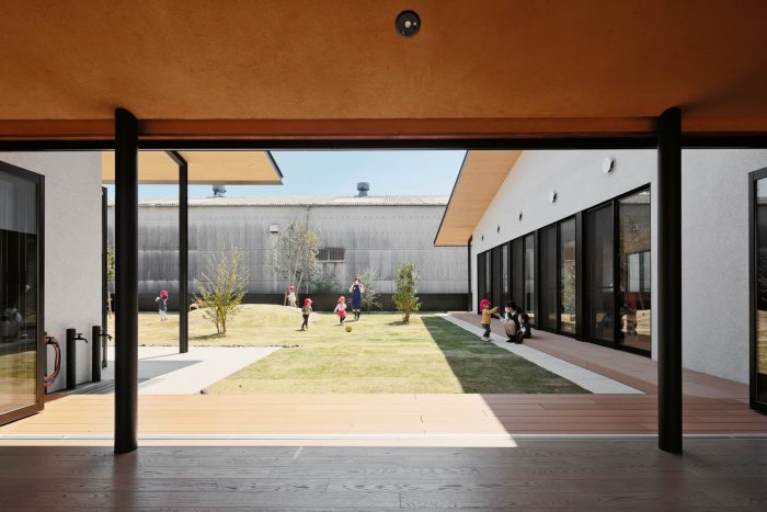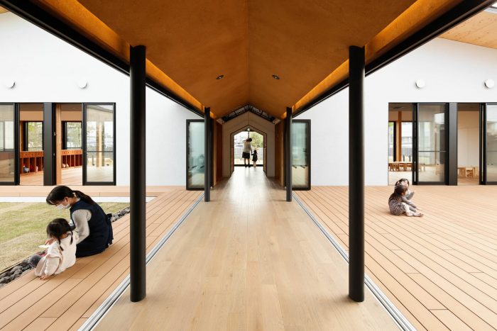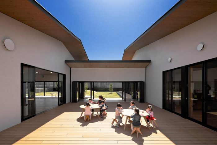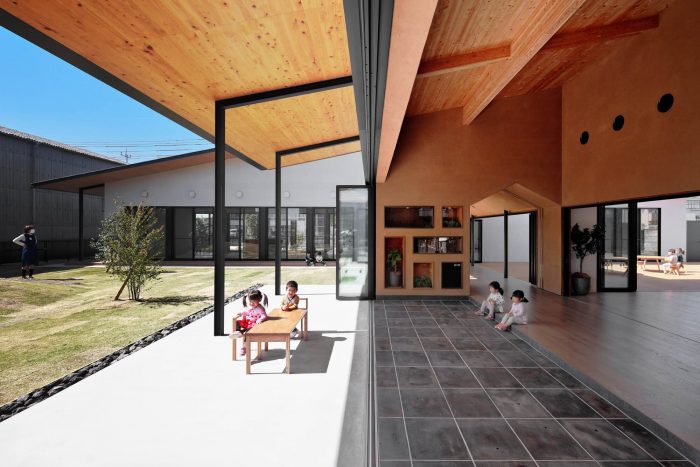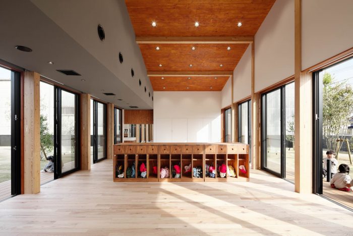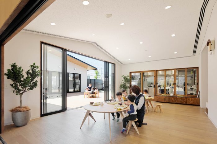 This is a facility newly built for 40 children who are from 1 year old to 2 years old in Maebashi, Gunma, with the concept ‘Feel the change of seasons. Maebashi city is located at the foot of Mt. Akagi and the weather changes a lot depending on the seasons. For example, in winter they have a strong and cold wind from Mt Akagi, called ‘Akagi Oroshi’ and they feel the change of seasons very well.