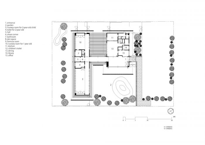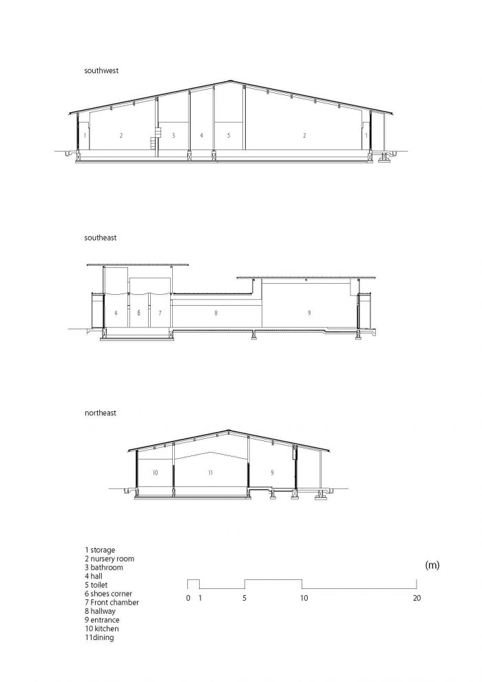 最近单调的苗圃环境似乎在增加。但在这个项目中,我们认为这是一个问题,许多幼儿园的房间被设计成易于成人控制儿童,所以人们在其中度过舒适的时间感受自然的设施。由于环境感觉像自然,所以安装了一些日本传统房屋的元素,这些元素有很多面对自然和管理自然的想法。深屋檐和大窗户可以吸收风和阳光,这取决于季节的变化。泥墙具有隔热和防潮的作用。通过这些方式,孩子们可以发展身体机能,同时即使在室内也能感受到大自然。此外,两个连接的房间也是日本的传统房屋风格。通过将两个房间连在一起,孩子们可以在老师的看护下安全地玩耍。