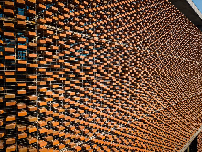 对于外墙,我们使用了50,000块砖来创造一个自我组织的外墙,让自然来控制砖的外观,而这以后,将成为建筑的一个特征。
