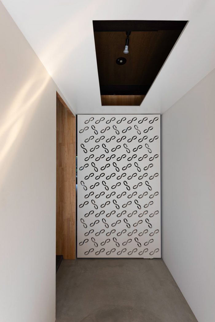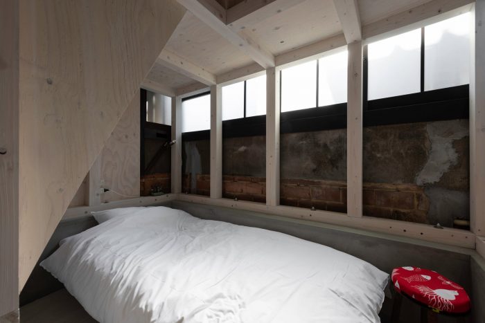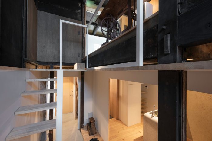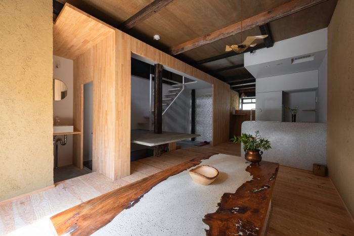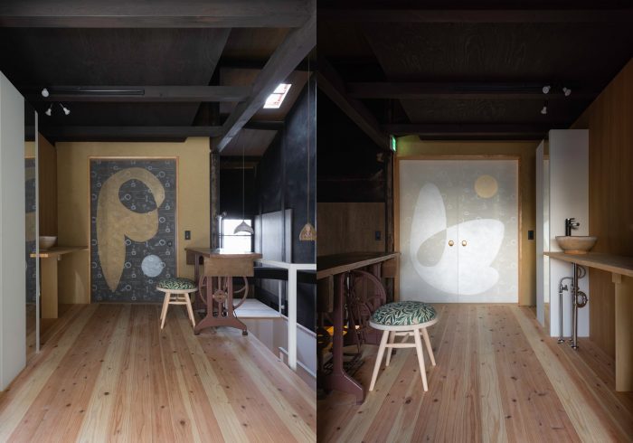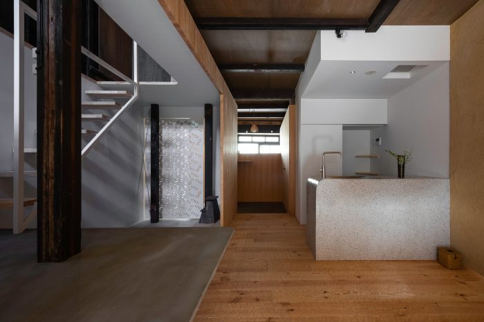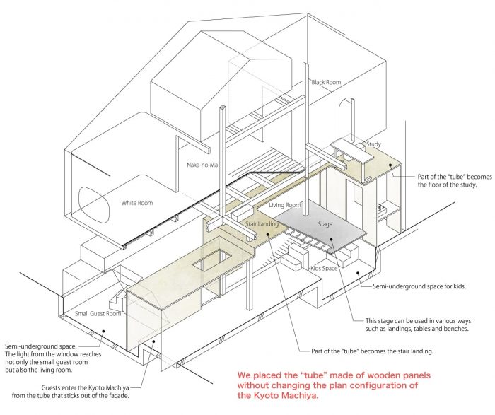 We placed the “tube” made of wooden panels without changing the plan configuration of this Kyoto Machiya. Guests enter the Kyoto Machiya from the tube that sticks out of the facade. The tube obscures the internal space of the Kyoto Machiya and creates a three-dimensional composition and continuity.