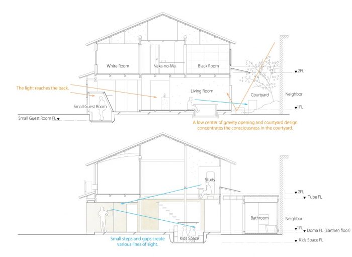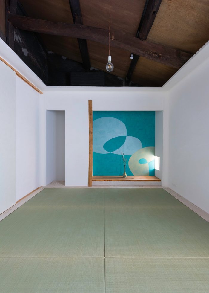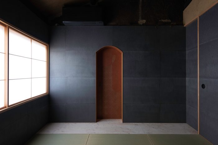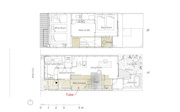 The tube has openings at the tops and the sides. Guests can feel the insides and the outsides of the spaces by passing through the openings.We designed various spaces, such as a living room with mud-made traditional walls and traditional floorboards with an uneven surface, a white room with stucco, a black room with black Japanese papers, and the semi-underground space that kids can play.