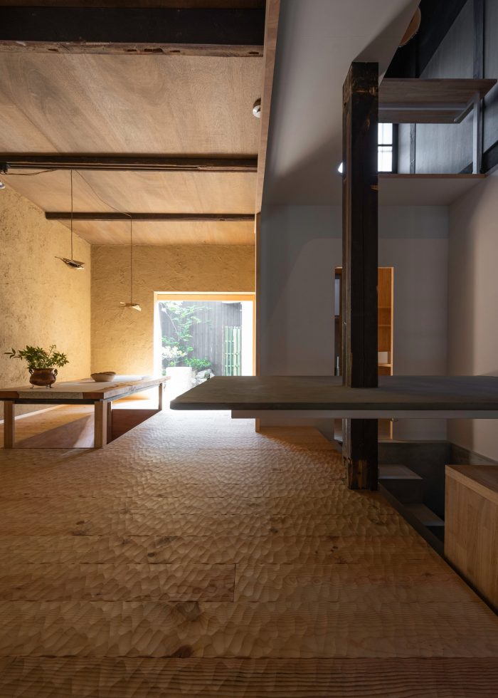 我们在不改变这个京都町屋的平面配置的情况下,放置了由木板制成的 "管子"。客人从伸出外墙的管道进入京都町家。这个管子掩盖了京都町屋的内部空间,并创造了一个三维的构成和连续性。