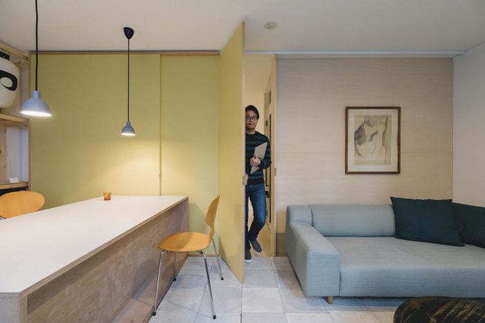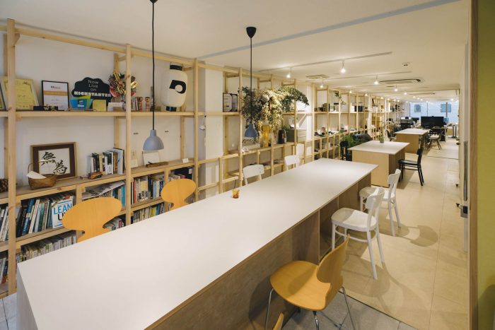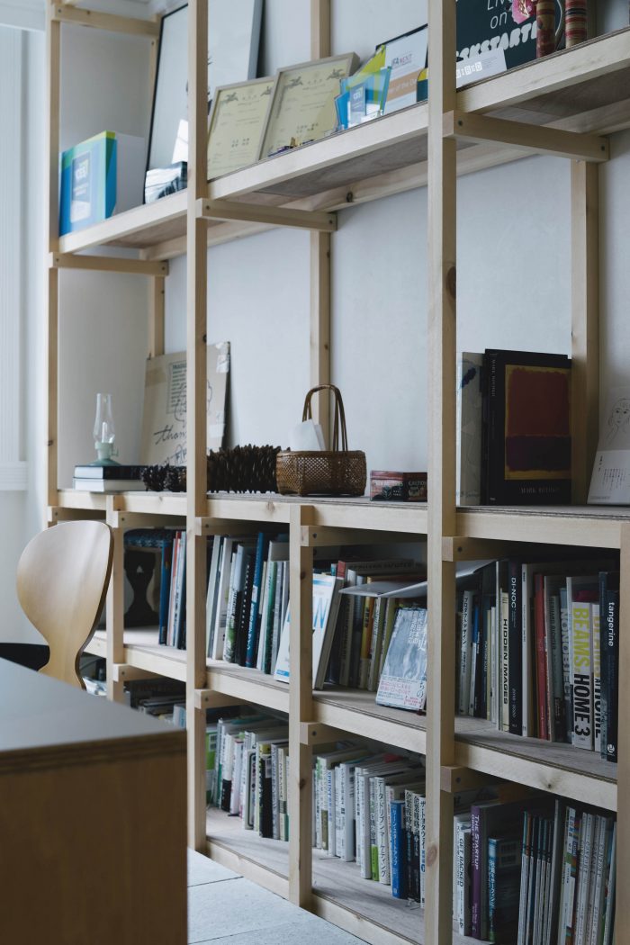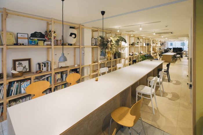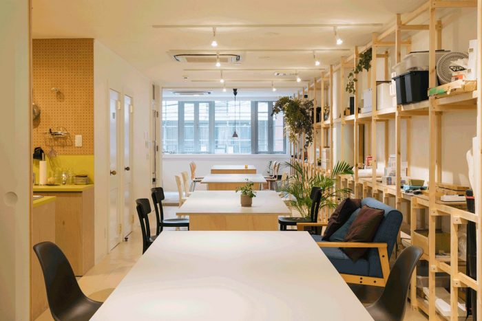 A new office space designed for a ‘Calm Design’ global start-up firm “mui Lab” from Kyoto. Located along Ebisugawa street known as a furniture craft + retail district, a deep tenant space (on previous Kyoto-machiya plot) is renovated with minimal interventions of a 21-meter-long grid shelf, a set of fixed/movable tables, and two big sliding doors.
