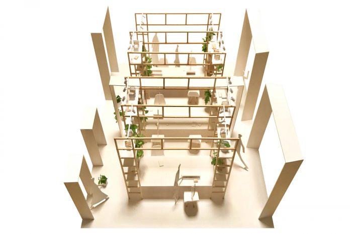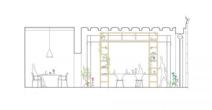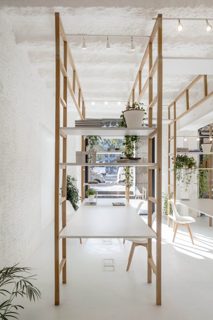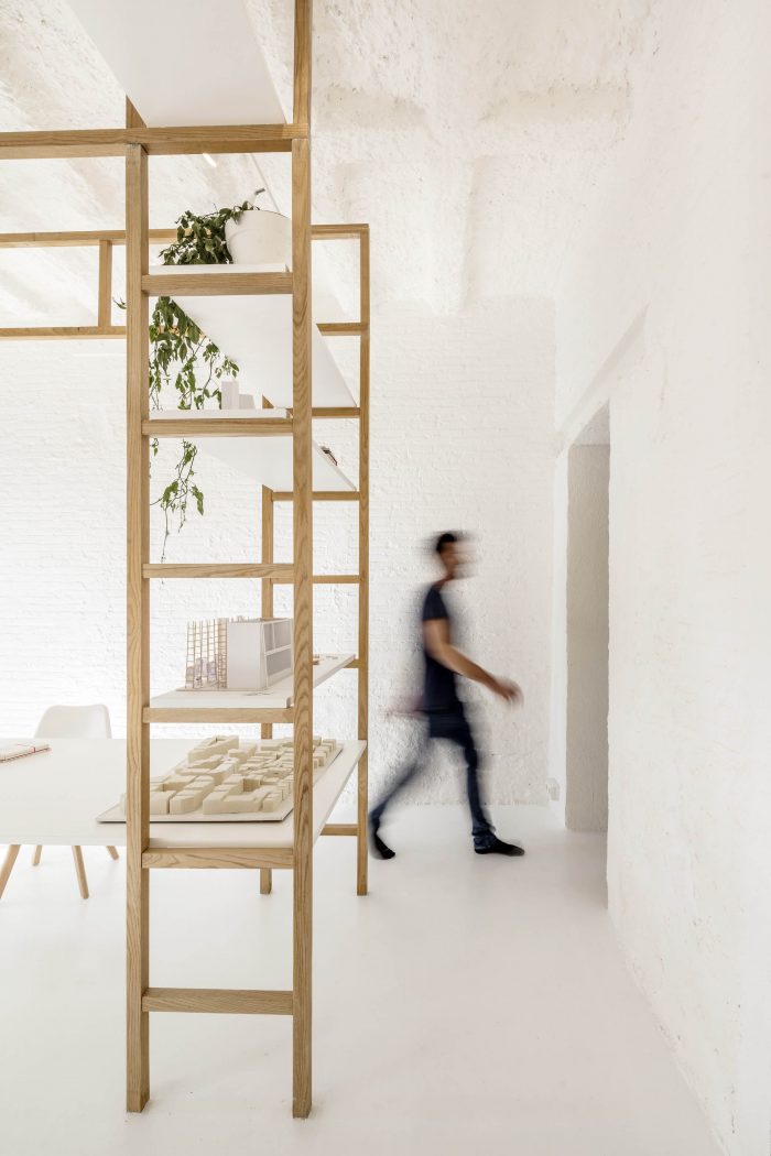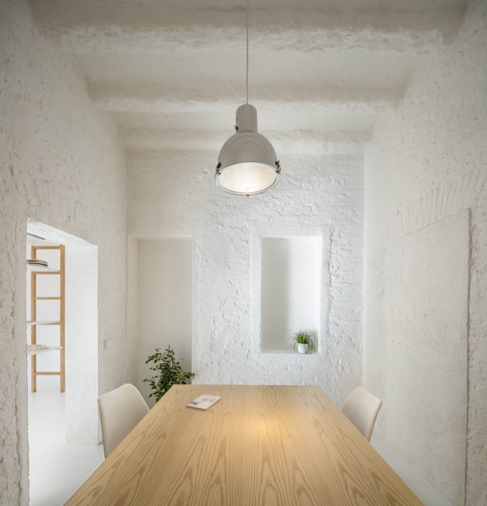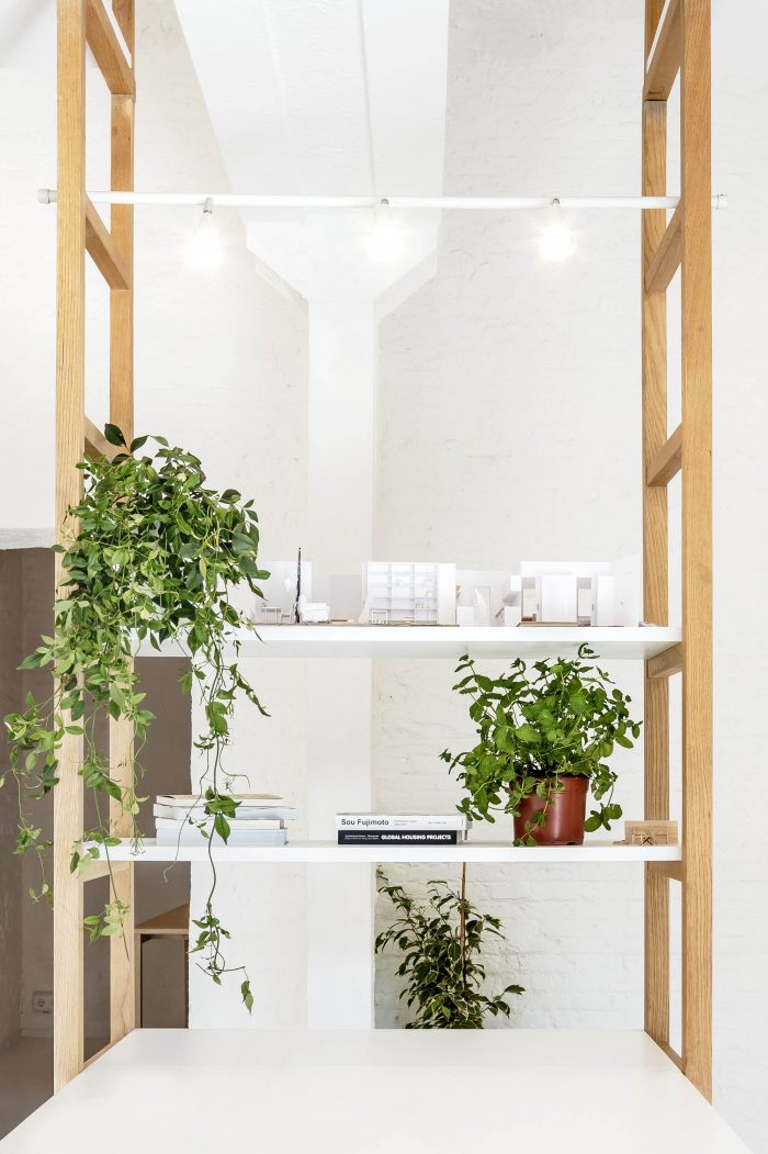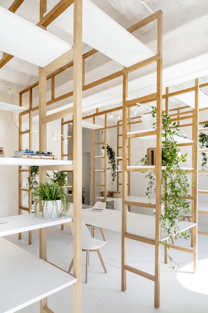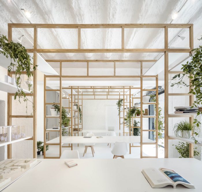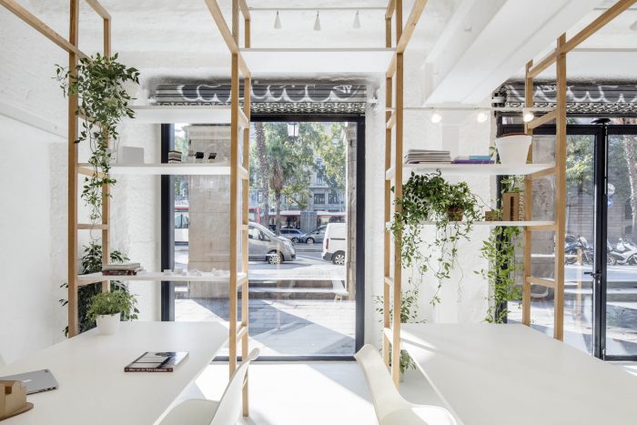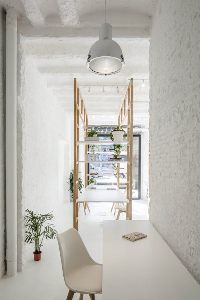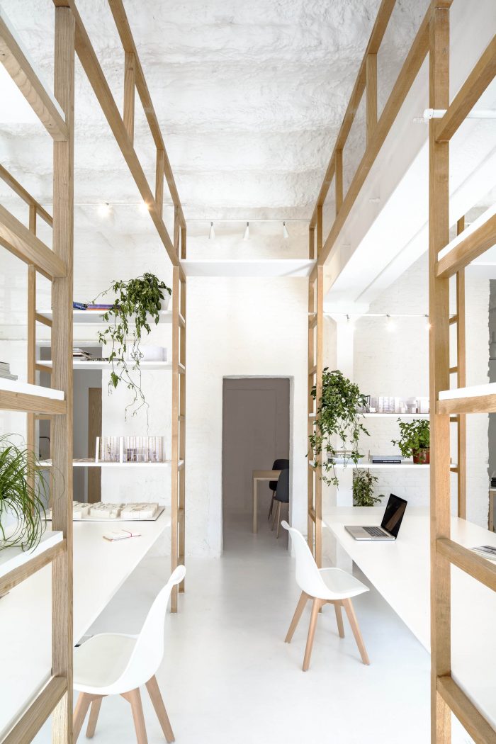 This project presents the opportunity to convert a mid-nineteenth century space into a multidisciplinary design office located in the El Born district arcades, in Barcelona. The principal concept was to create an atmosphere where the old constructed forms highlight the new geometry that melds with nature and the human. The first intention was to recuperating the heritage value of the existing architecture through several interventions that aim to reveal its material potential. The plaster-work was peeled back to make visible the stone and old bricks walls, and the false ceiling was removed to show the fireproofing protected wooden beams.