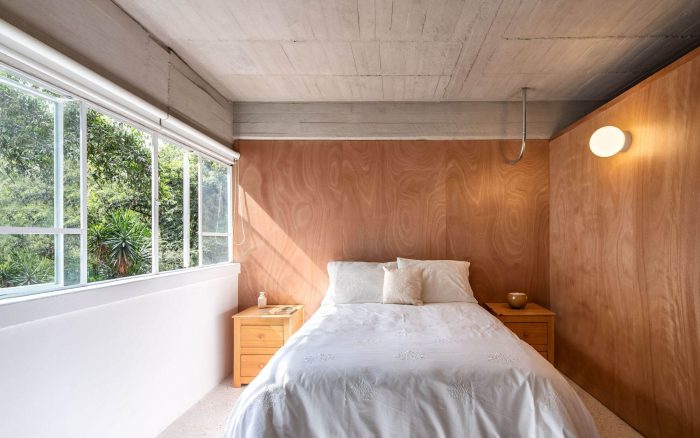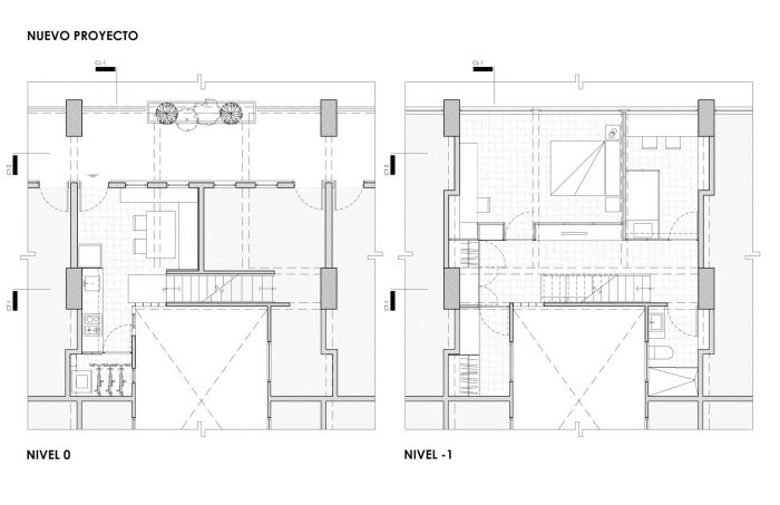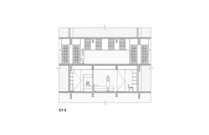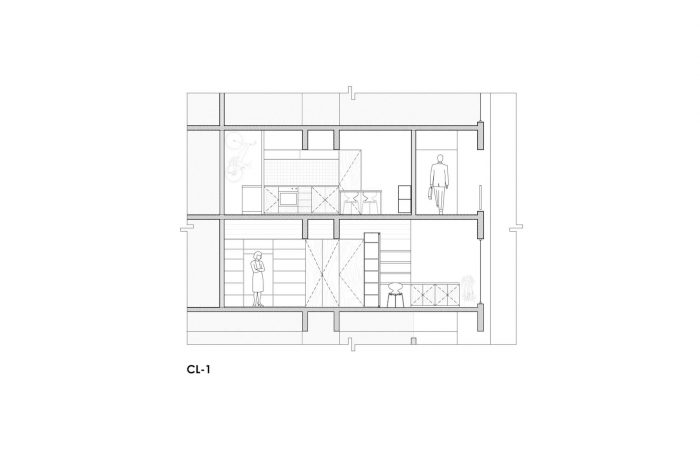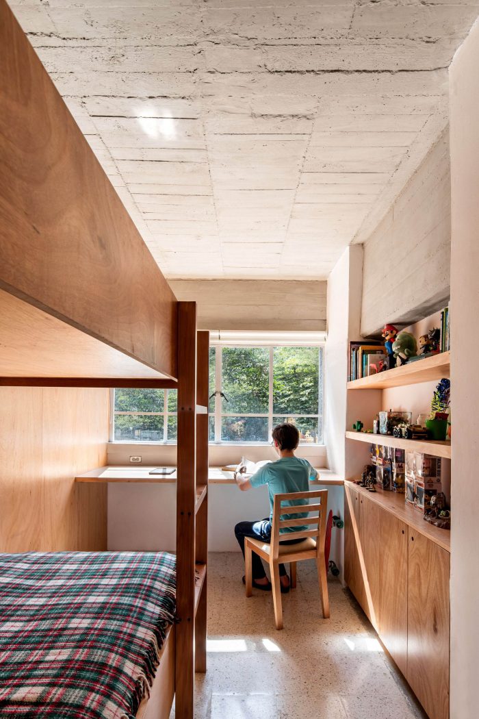 The complex contains 1,080 apartments distributed in 6 high rise building and 6 smaller buildings within a super block whose built footprint occupies roughly the 30% of the block’s area. On the ground floor the buildings are equipped with urban infrastructure such as commerce spaces, sport facilities, schools and green areas for its inhabitants. The buildings have a robust and modular structural system of concrete beams and columns that avoid structural walls and allow flexibility to reconfigure the interior of the apartments. There are 5 typologies of apartments that range from 48 to 76 square meters. Our clients, a couple with two sons, moved to the CUPA 15 years ago. Their apartment has 55 m² in two levels. In the access level (12m²) the kitchen and dining room and in the lower level (43m²) a space without partition walls for the three beds, the tv, a sofa, an enclosed bathroom/laundry room, their bikes and lots of boxes where they store their clothes and other belongings. After analyzing the current state of the apartment, the main issues that we identified were the lack of privacy, lack of storage space and the deterioration of floors, stuccos, doors and windows.