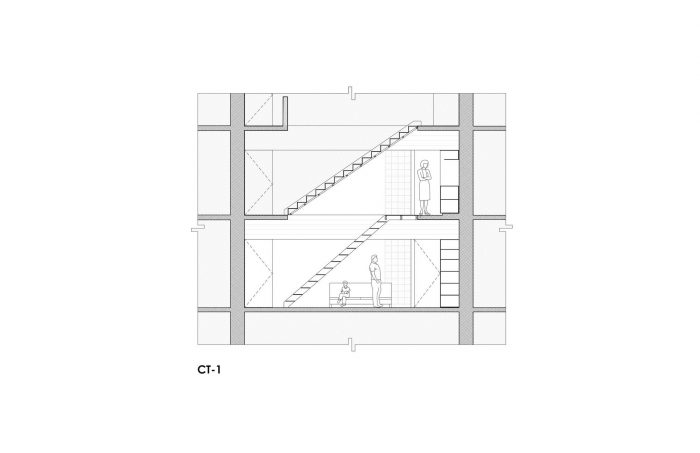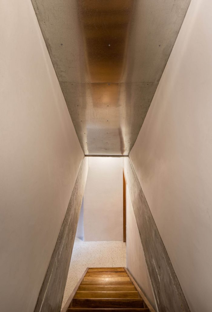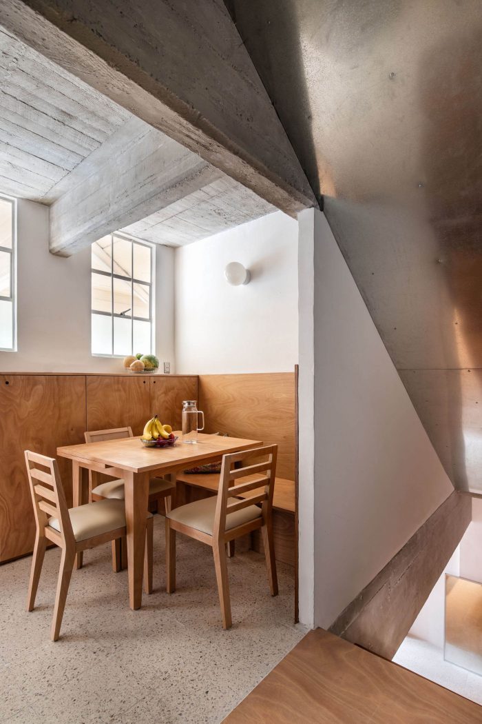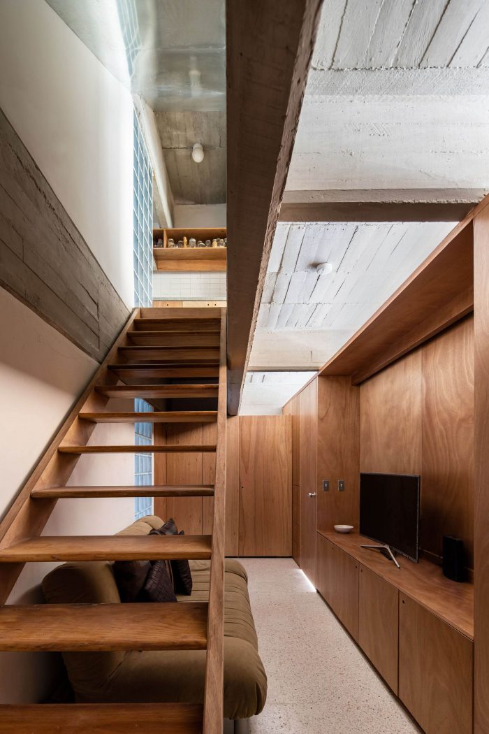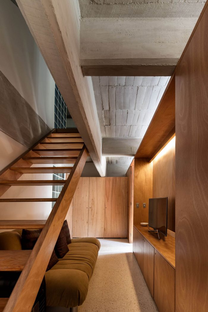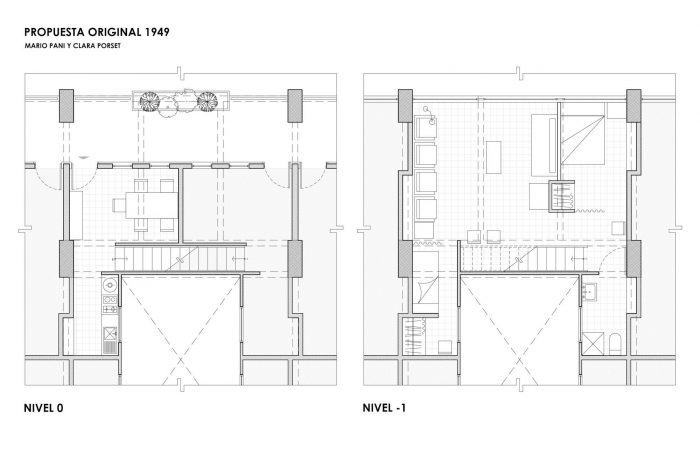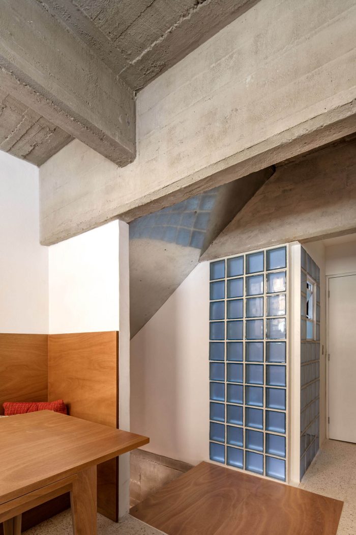 Our proposal intervenes the original wooden staircase by making it steeper and shorter to gain area in the access level and gain height in the dead space below the staircase. By increasing the floor area on the access level we were able to grow and build a new dining room, relocate the new kitchen and generate laundry room and bike storage behind the new kitchen. On the lower level, the dead space under the staircase where the bikes were stored was transformed into a TV room. To solve the problem of privacy between the bedrooms and the lack of storage, we proposed the reconfiguration of the spatial arrangement through a large piece of carpentry with storage cabinets that function as a dividing element between the bedroom spaces, tv room and dressing room. This carpentry element respects the different heights of the concrete beams, allowing the beams to pass freely over the top in order to have more light in the TV room and embrace the structural continuity of the concrete beams. This same element also configures the desks for each bedroom and the new bunk bed in the children bedroom. In the niches of the adjoining walls we proposed to have built-in storage furniture as originally proposed by Clara Porsett in her furnishing proposal of 1947. To increase the amount of light inside the house, some partition walls were replaced by vitroblock walls towards the ventilation cube that is at the back of the apartment. The pre-existing dark linoleum floors were also replaced with a white terrazzo. Plaster was removed from the beams and ceiling to reveal the texture and beauty of the concrete formwork. The bathroom was reconfigured and fitted with new bathroom cabinets and new tile. The reform also included a new lighting proposal, the restoration of the original gates, windows and a new galvanized steel ceiling underneath the neighbor's staircase that protects the apartment from recurring water leaks.