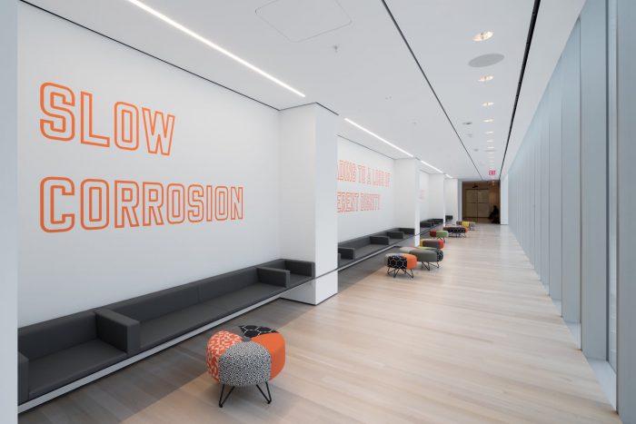 The 3,900 square foot street-level galleries, including the dedicated Projects Gallery, are free and open to all on the expanded ground floor. The double-height Projects Gallery (26’- 6”) is responsive to variable media and scale, integrating roll-up shades for projections and blackout shades to enable variable lighting control for projections. The custom-designed LED light fixtures can be reconfigured within the light track system. They provide an even wall-wash of light, ideally suited for mixed-media installations.