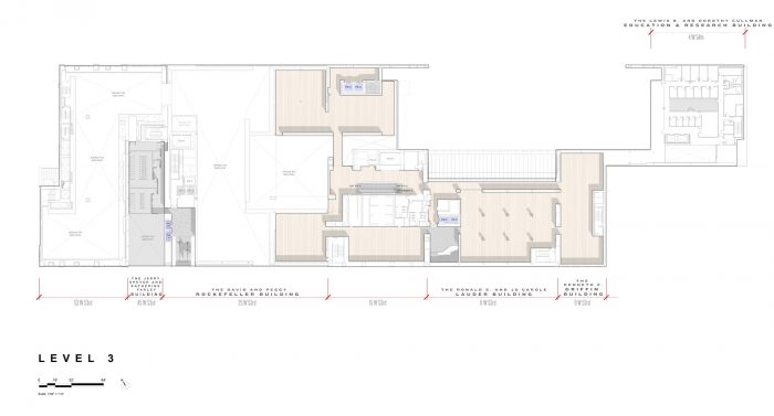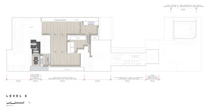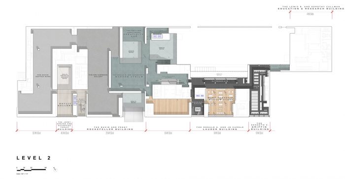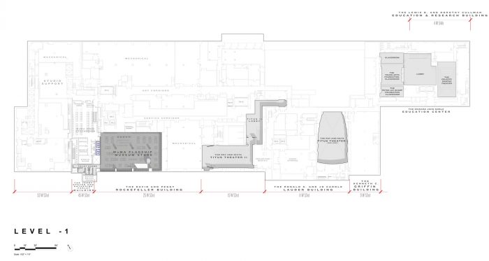 一个新的定制的入口顶棚欢迎游客从第53街进入一个双层高度的空间,在第53和第54街之间有一个不间断的视野,通过重新配置票务和衣帽间在这个中心轴线上得到解放。这个主要的入口由东边大厅的一个次要入口补充,该入口设有一个专门的电影台和会员接待和衣帽检查。游客可以通过西侧大厅的两个入口进入零售店和地面画廊。开放式的大厅配备了举办艺术装置的设备,在一楼免费向所有人开放。