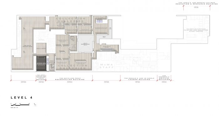 The overall expansion yields a net increase in MoMA’s gallery space of one third, to approximately 165,000 square feet, allowing the Museum to exhibit significantly more art in new and interdisciplinary ways. The design optimized current spaces to be more flexible and technologically sophisticated, expanded and opened up the main lobby into a light-filled, double-height space that connects seamlessly between West 53rd and 54th Streets, and created a multitude of circulation routes with more areas for visitors to pause and reflect. The state-of-the-art Studio in the heart of the Museum and an innovative second-floor Creativity Lab invite visitors to connect with art that explores new ideas about the present, past, and future. The flagship Museum store has been lowered one level and made visible to the street through a dramatic glass wall and a new sixth-floor café includes an outdoor terrace facing 53rd Street. The clear glass façade, new street-level galleries, and a ground floor free and open to all offer increased transparency and bring art closer to people on the streets of midtown Manhattan.